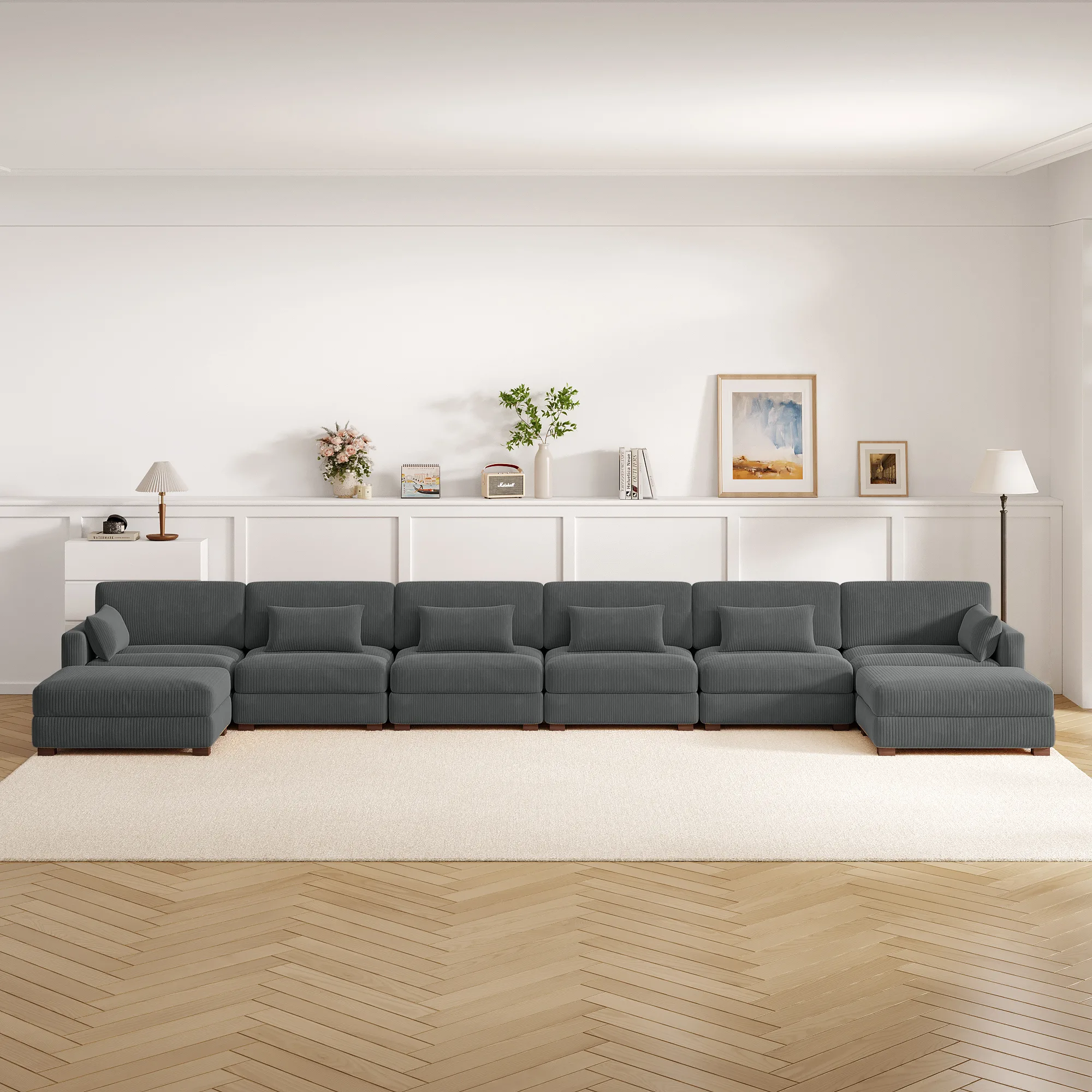 Got a long wall and a bigger guest list? Our Auralyn 6-Seat Corduroy Upholstered Sectional Sofa stretches out with a low-slung back, then pops up with adjustable headrests when you want more support. Corduroy brings a touchable 70s callback, and channel tufting keeps the seat surface looking crisp. Foam cushioning paired with coil springs delivers sink-in comfort with rebound. Two corner seats, four armless modules, and two ottomans let you build a U shape, double chaise, or lounge pit. Metal connectors and low solid wood legs keep everything aligned and grounded, so the room feels ready for long, easy nights together.