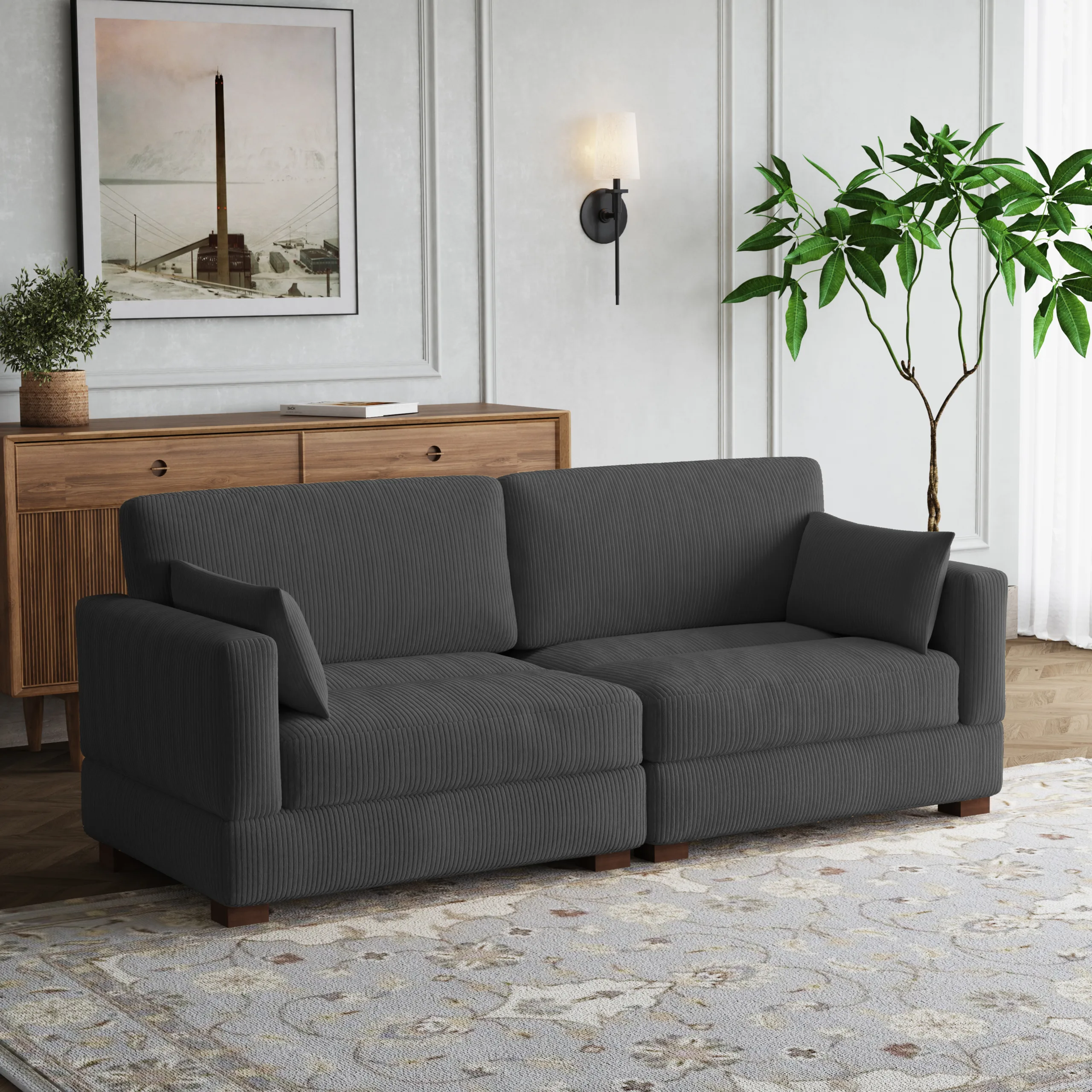 Start with our Auralyn 2-Seat Modular Corduroy Sofa, two corner chairs that settle into a low, relaxed sofa. It is made for catching up, reading a chapter, or letting the evening stretch. Wide-wale corduroy adds cozy texture, channel tufting keeps the look clean, and pillows soften the corners, so your recharge time looks as good as it feels.