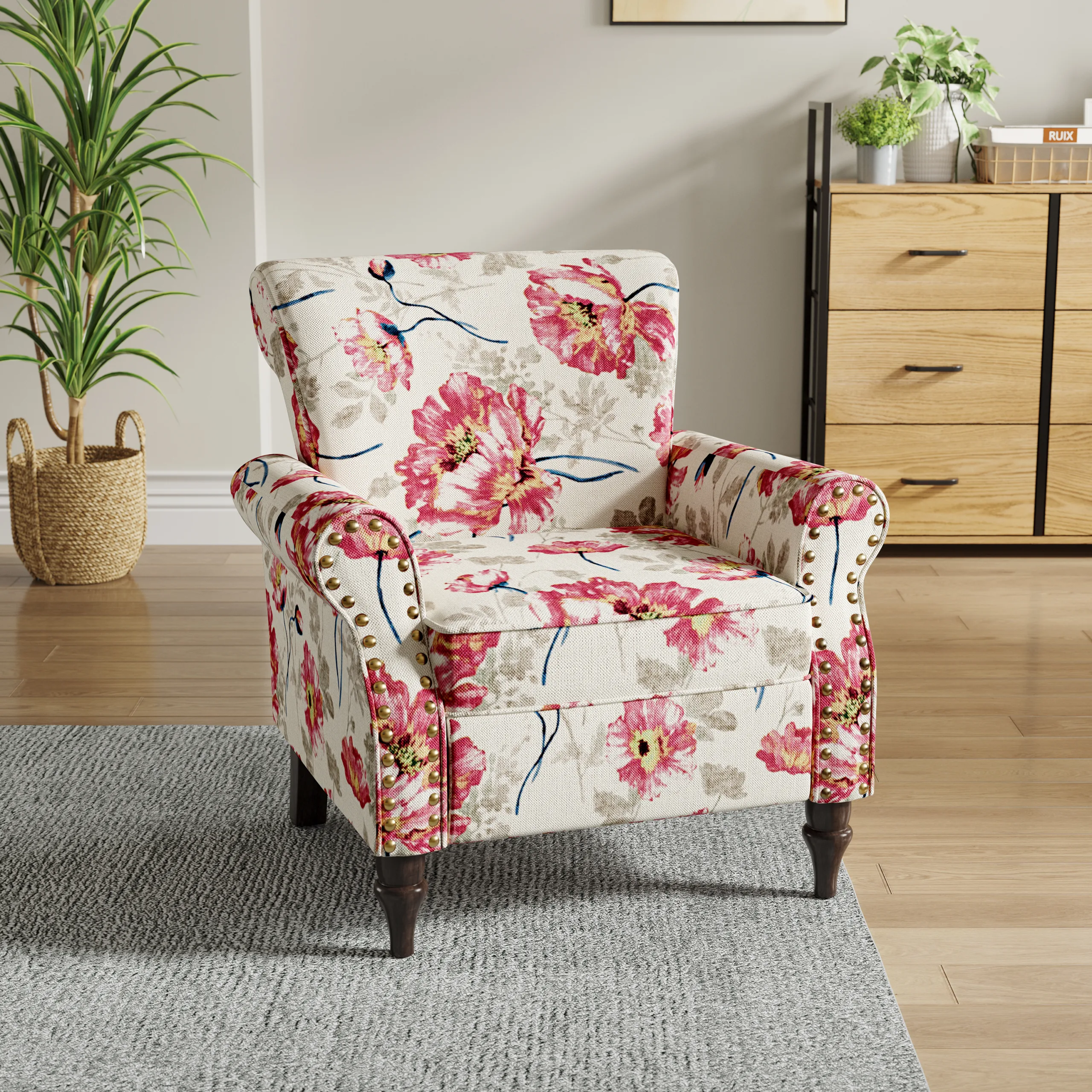 Is it time to retire the oversized sectional in a smaller living room? Build a lighter conversation setup with two of our Aveloy rolled arms accent chairs in solid cotton linen and a small round table. The fabric keeps the look airy and calm against wood floors and greenery, leaning Japandi or modern farmhouse. Rolled arms give an easy, natural grip, while the vertical nailheads add a touch of dressed-up structure.