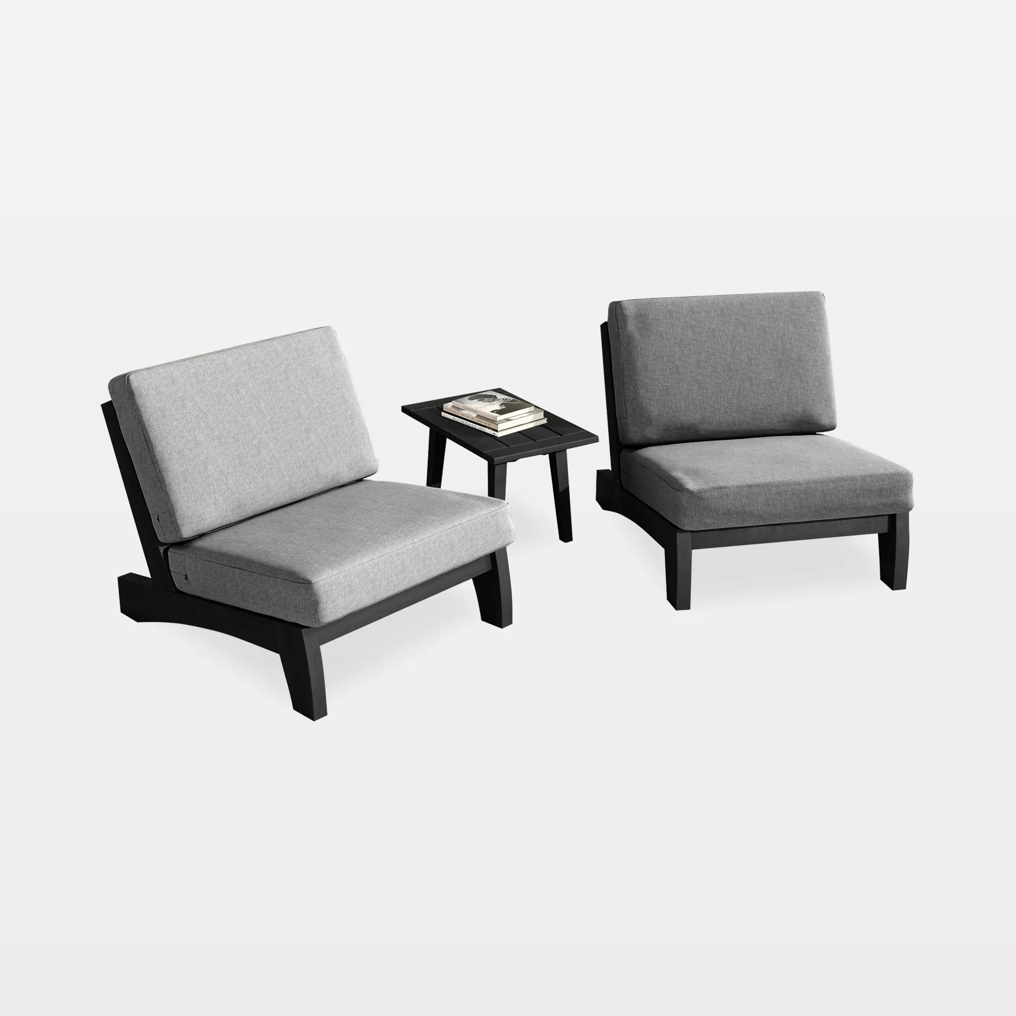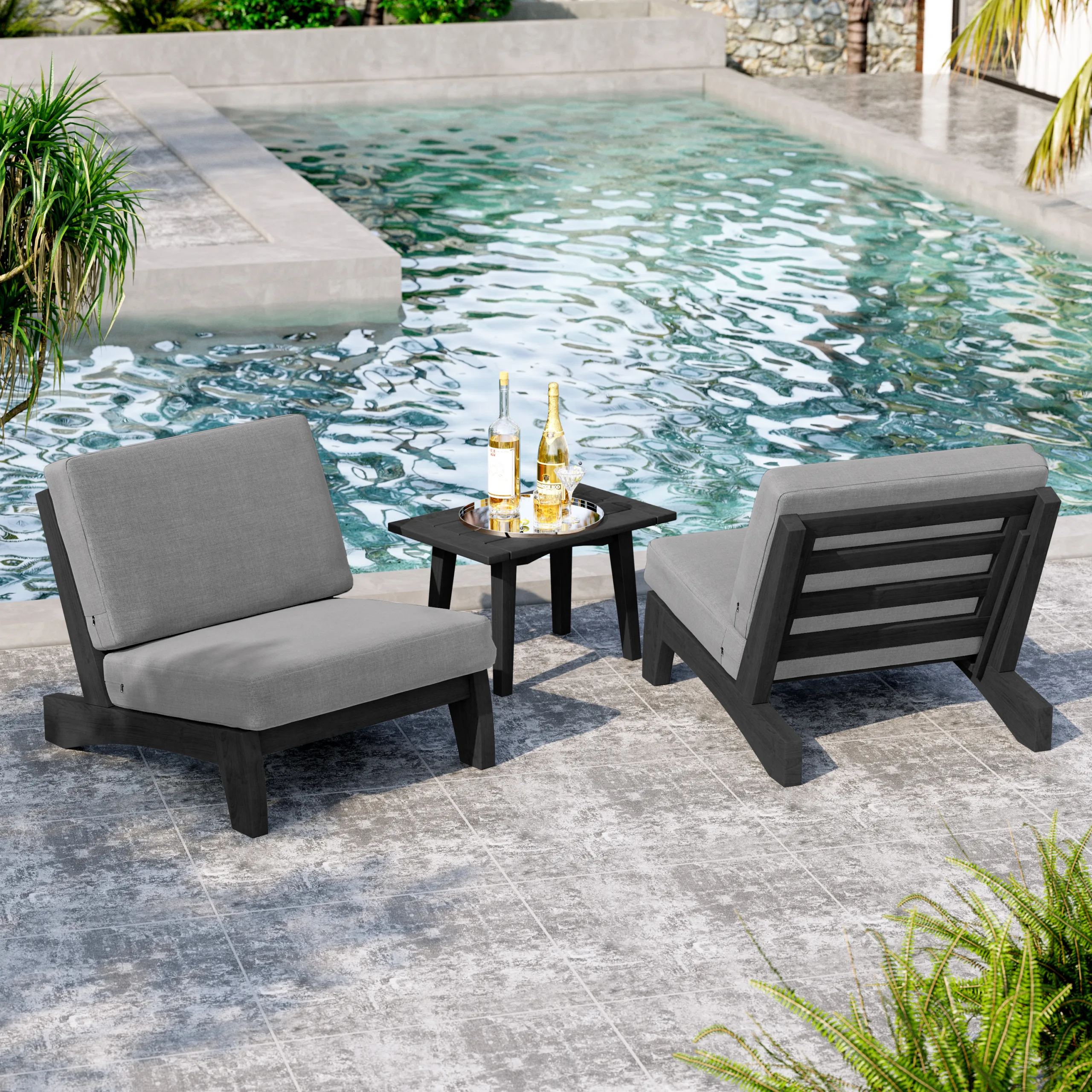 Includes two armless chairs plus a teak side table for everyday outdoor essentials.