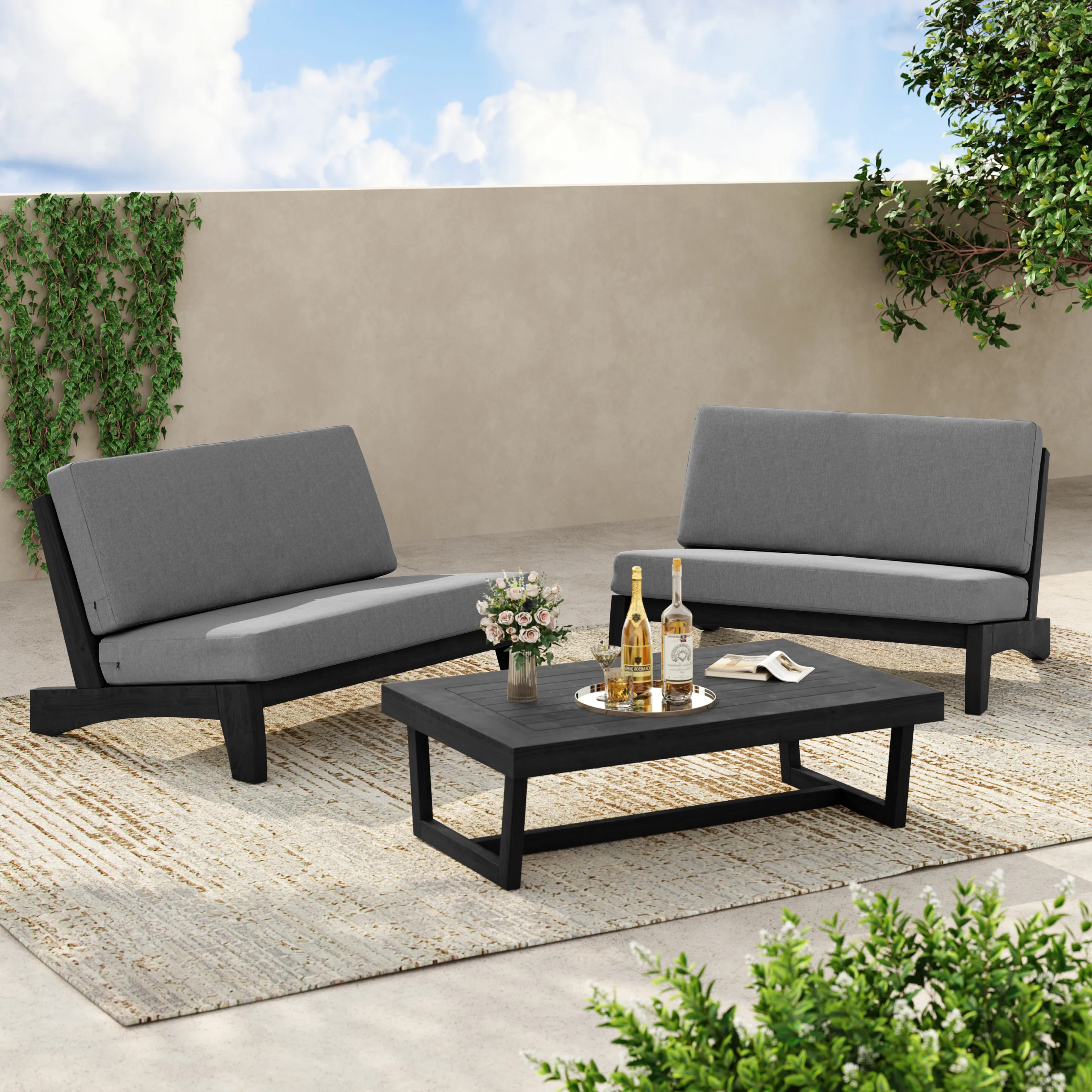 3-piece set includes two loveseats and a teak coffee table for relaxed outdoor hosting.