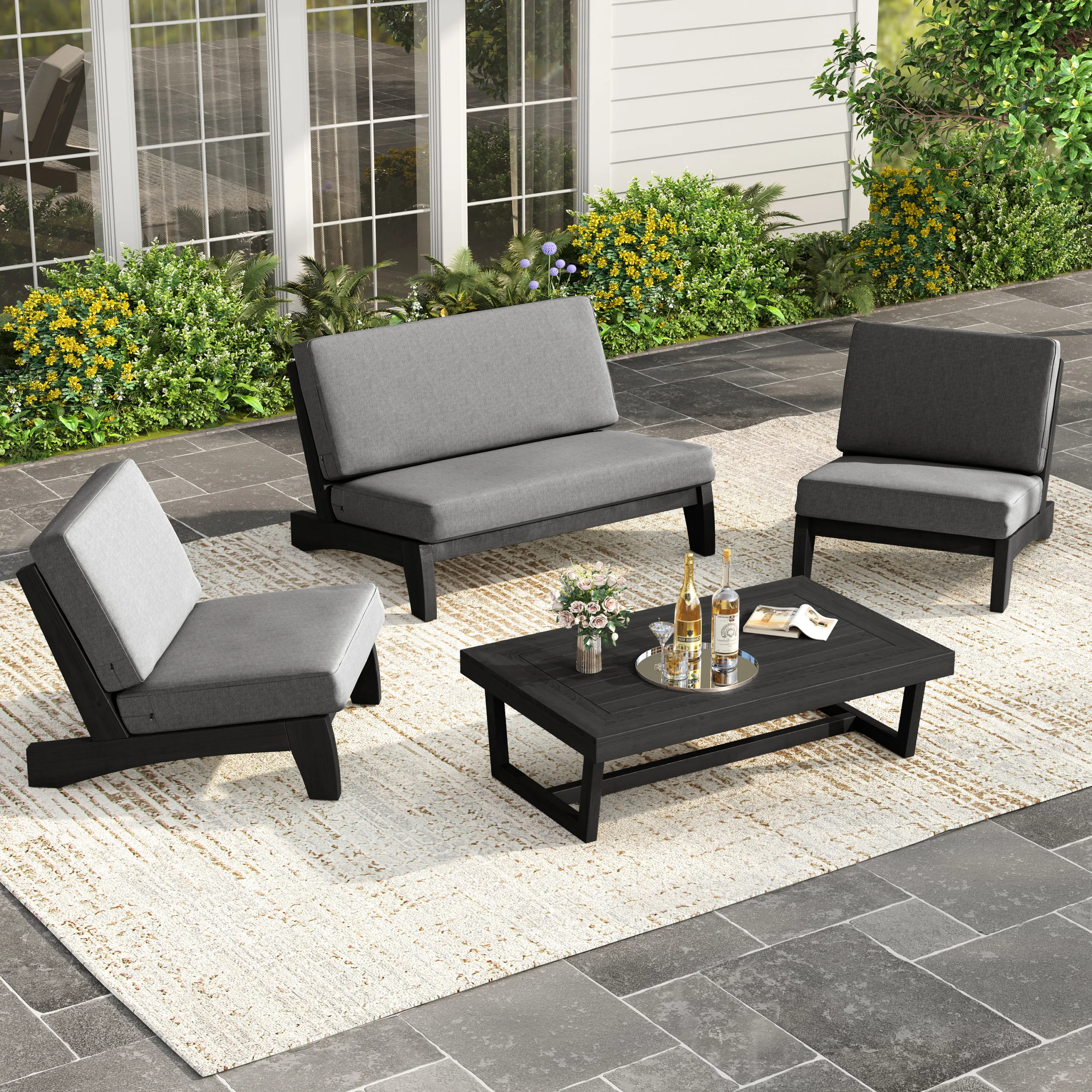 4-piece set includes a loveseat, two chairs, and a teak coffee table for gatherings.