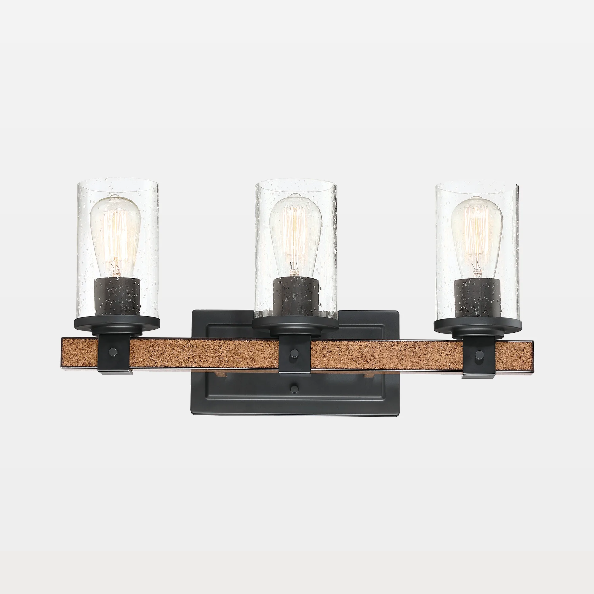 This 3-light vanity fixture brings a sleek, modern look to your space, thanks to its mixed materials and two-tone finish. The backplate is crafted from metal in a matte black hue, while both arms and the brown-toned horizontal bar exude rustic charm. All three holders are round and keep a 60W bulb (each sold separately) in place. Plus, cylindrical clear glass shades let the light filter through to better illuminate your space. We love that you’re able to install this vanity light facing up or down depending on your preference. Rated for damp locations, it’s also safe to use in bathrooms.
