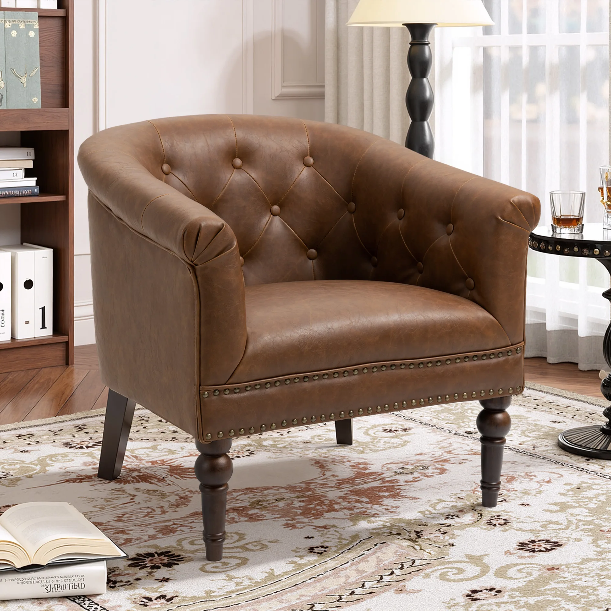 Place it in a home library beside a dark bookcase and a reading lamp, then let the tufting do the talking. In a rustic living room, it pairs naturally with a brick fireplace and a worn-wood coffee table. Or use it to anchor a café corner where jazz plays low and the lights stay soft. Wherever it lands, our Brieton barrel chair brings a grounded, classic seat that invites you to stay awhile.