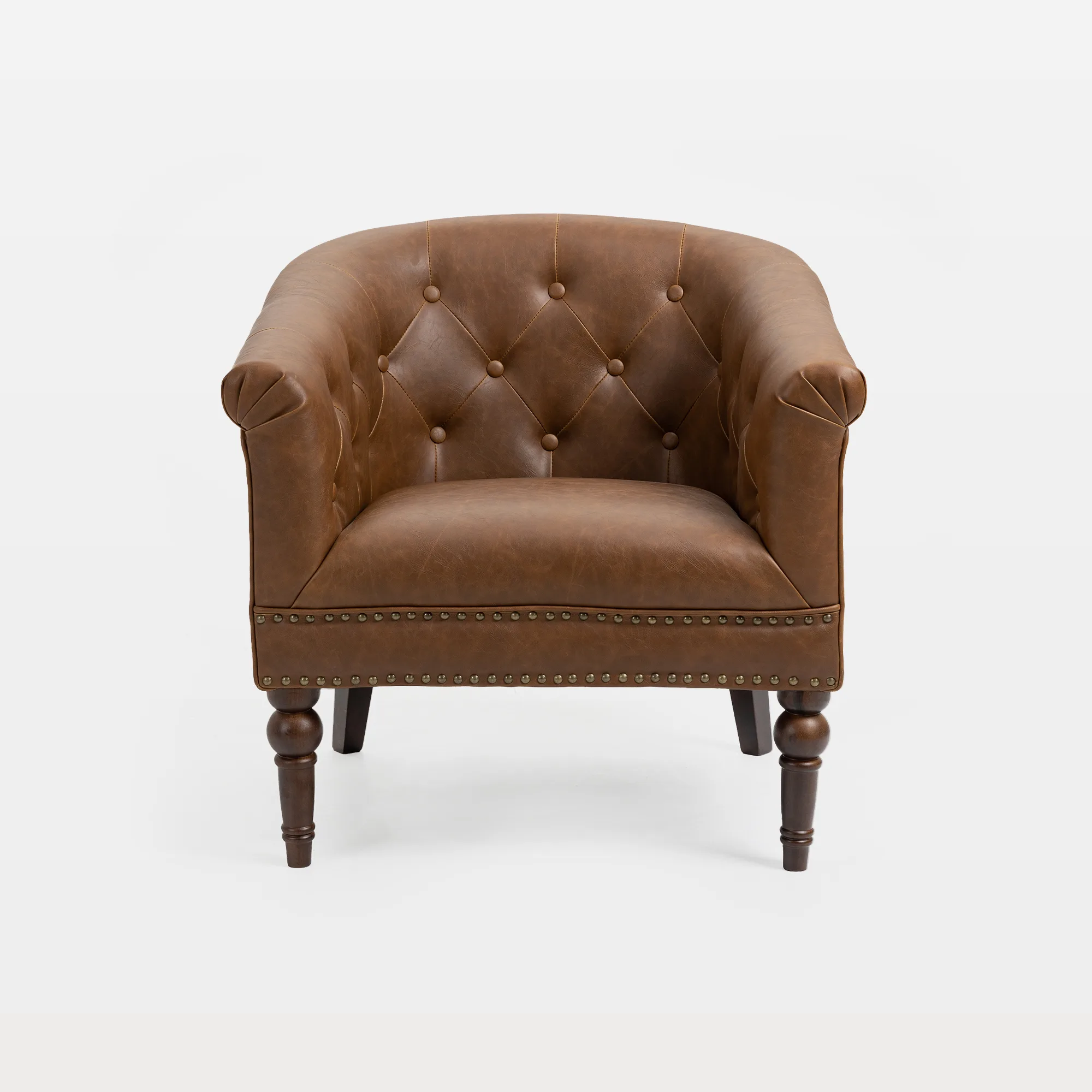 Want a corner that feels like your grandfather’s study, warm and lived-in? Our Brieton button tufted club chair borrows the Chesterfield look with deep diamond tufting that catches light and shadow. The faux leather adds that old-library richness, while the barrel shape and pleated rolled arms keep the seat friendly, not stiff. A spaced nailhead belt along the base rail and turned legs finish the heritage mood.