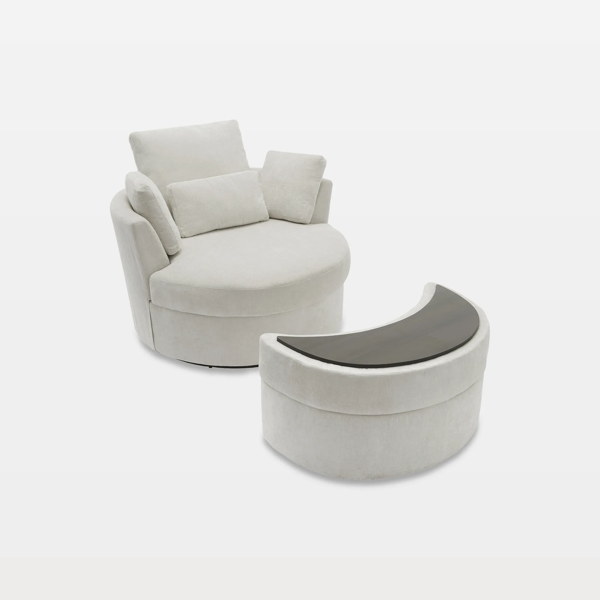 Discover the elegance of our 4-Pillow Swivel Armchair, designed to blend sophisticated style with exceptional comfort. This armchair features gently curved backrests that offer remarkable lumbar support and a well-padded seat that ensures robust lower back support. The luxurious linen fabric provides a soft, cloud-like seating experience, perfect for both relaxation and reading. Expertly crafted from a combination of solid wood and engineered wood, this armchair boasts a spring seat structure engineered to resist sagging and maintain its shape. The high-density foam and premium soft fabric enhance comfort, making this chair a perfect choice for lounging or reading. Additionally, the integrated storage ottoman enhances practicality while maintaining a stylish appearance.
