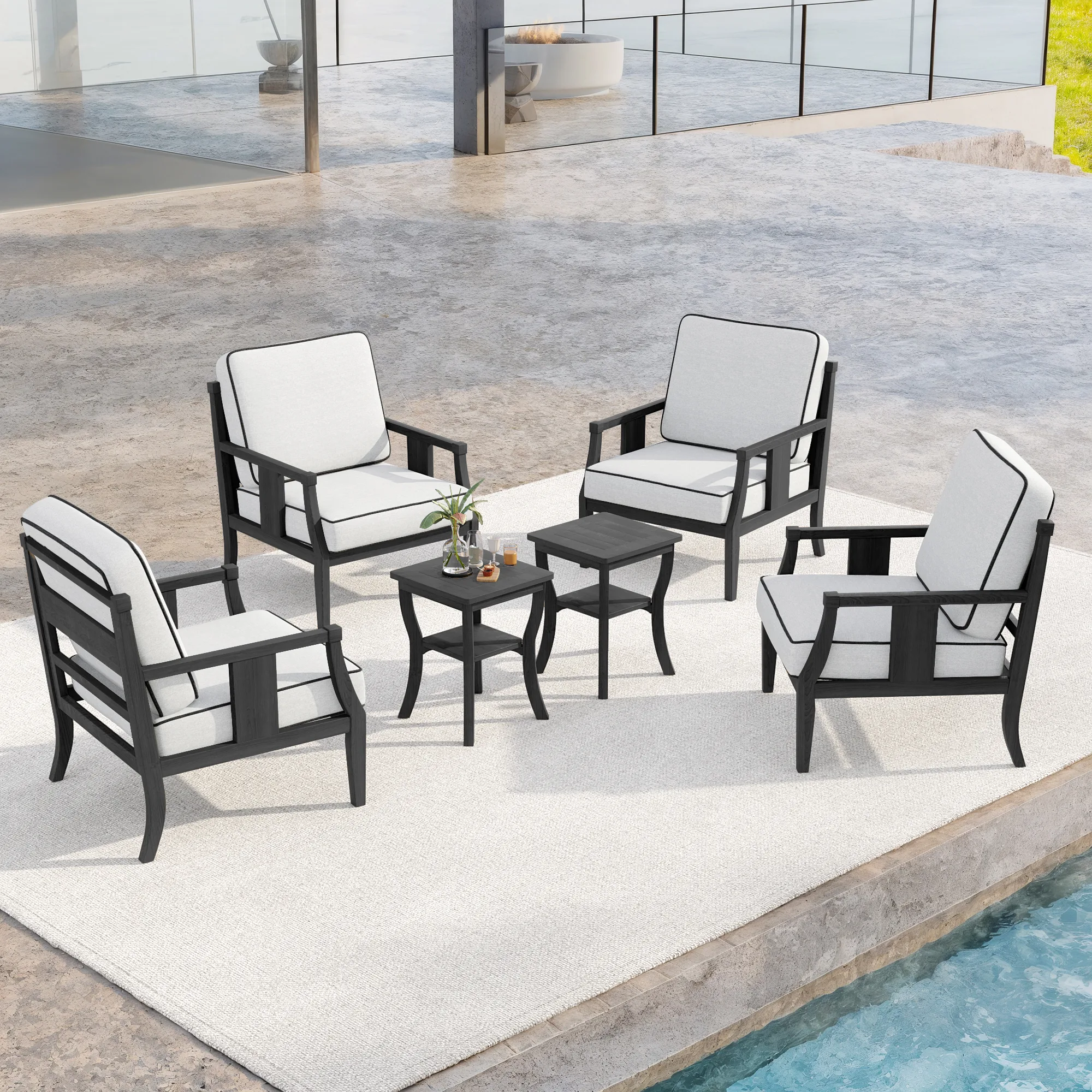 Includes four cushioned teak armchairs and two coordinating outdoor side tables for flexible layouts.
