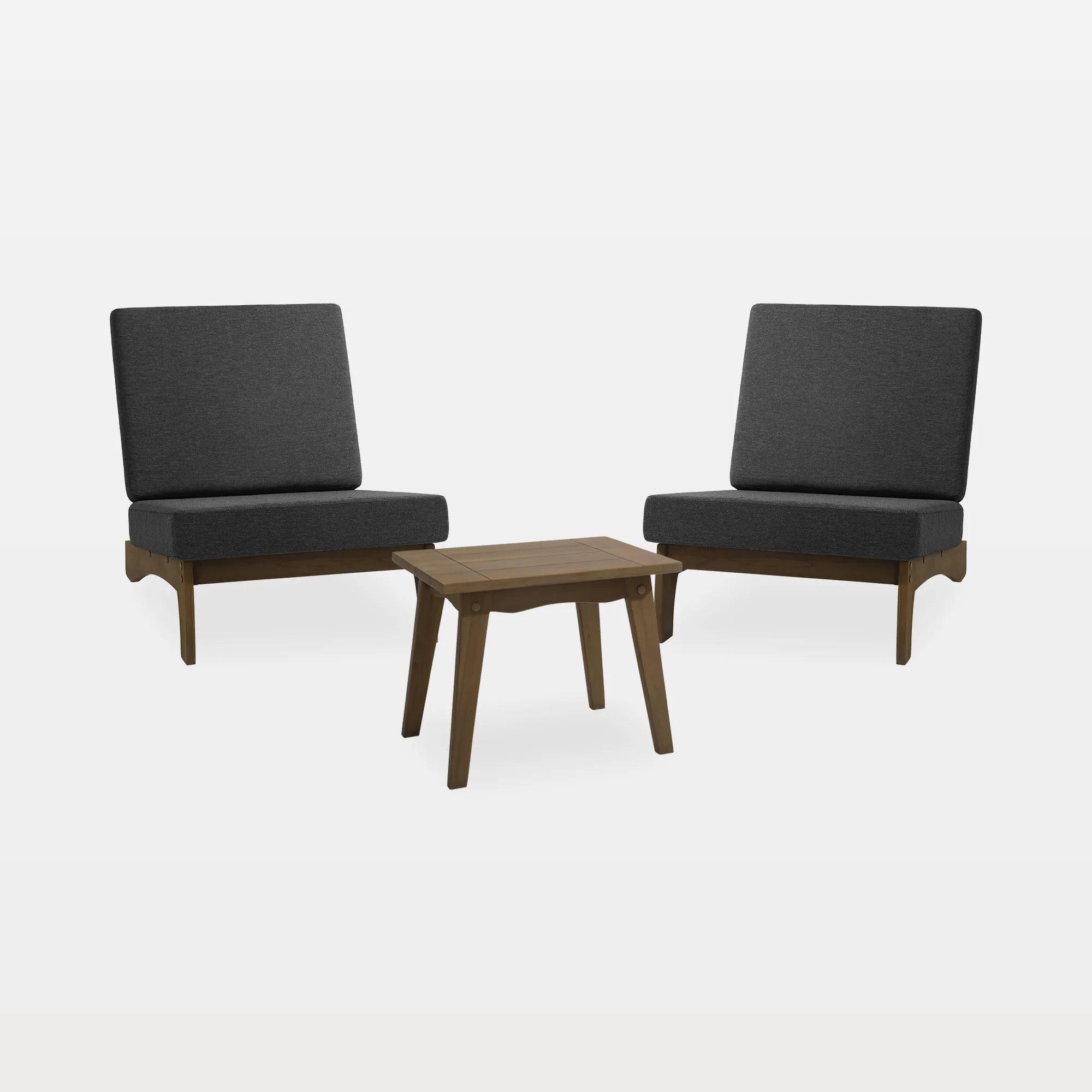 This modern 3-piece conversation set is just right for creating an intimate outdoor space for two. It includes a sleek coffee table and two club chairs, each with fade-, UV-, and water-resistant cushions for year-round enjoyment. The table is crafted from a mix of solid and engineered wood, while the chairs feature a polyester blend upholstery for added comfort. The set is designed for easy maintenance with spot cleaning and hand washing recommended. So, go ahead and enjoy those long, leisurely chats with your favorite person – this set has got you covered.