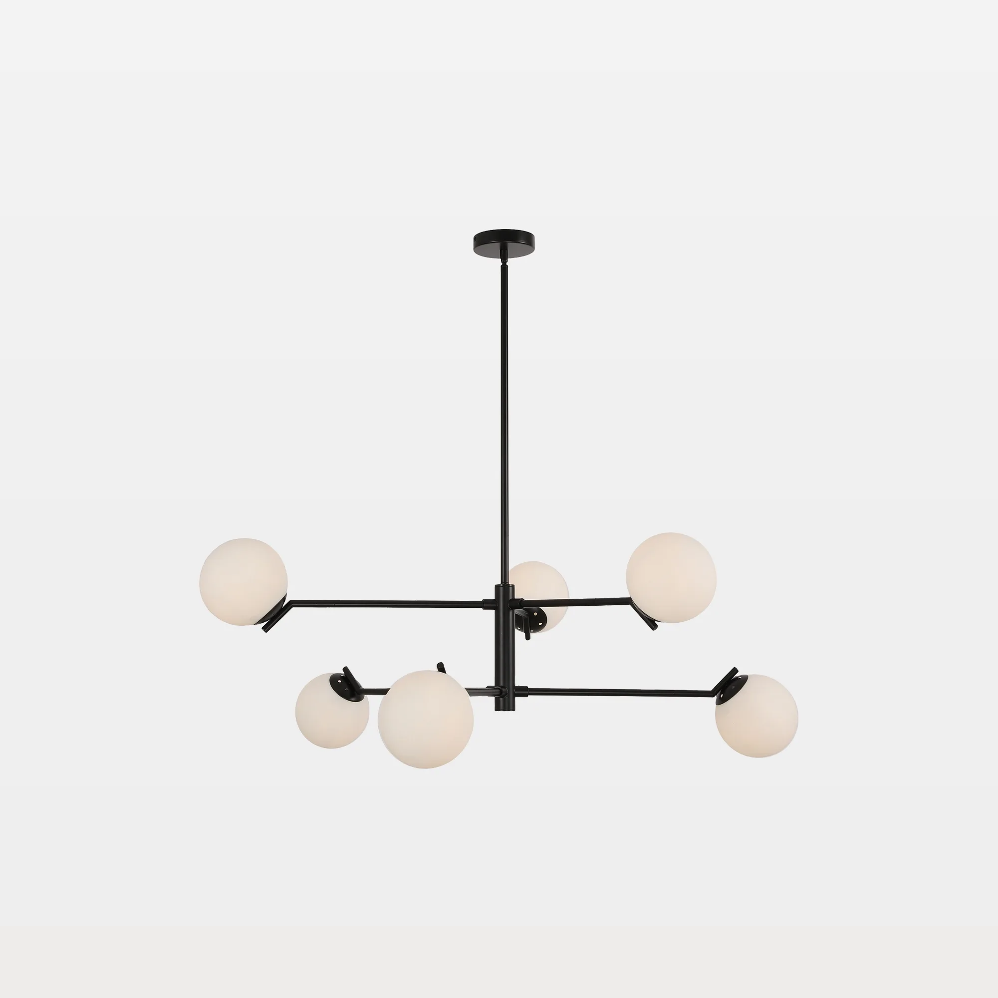 A fusion of modern design and functionality, this six light chandelier brings both form and purpose. With six arms extending outward, each featuring a refined glass ball shaped shade, it delivers warm, even lighting. The durable metal structure ensures stability, even on sloped ceilings. Need adjustable brightness? The dimmable feature lets you set the mood (need to purchase compatible dimmer switch and bulbs separately). Whether for entertaining or relaxing, this piece is a perfect fit.