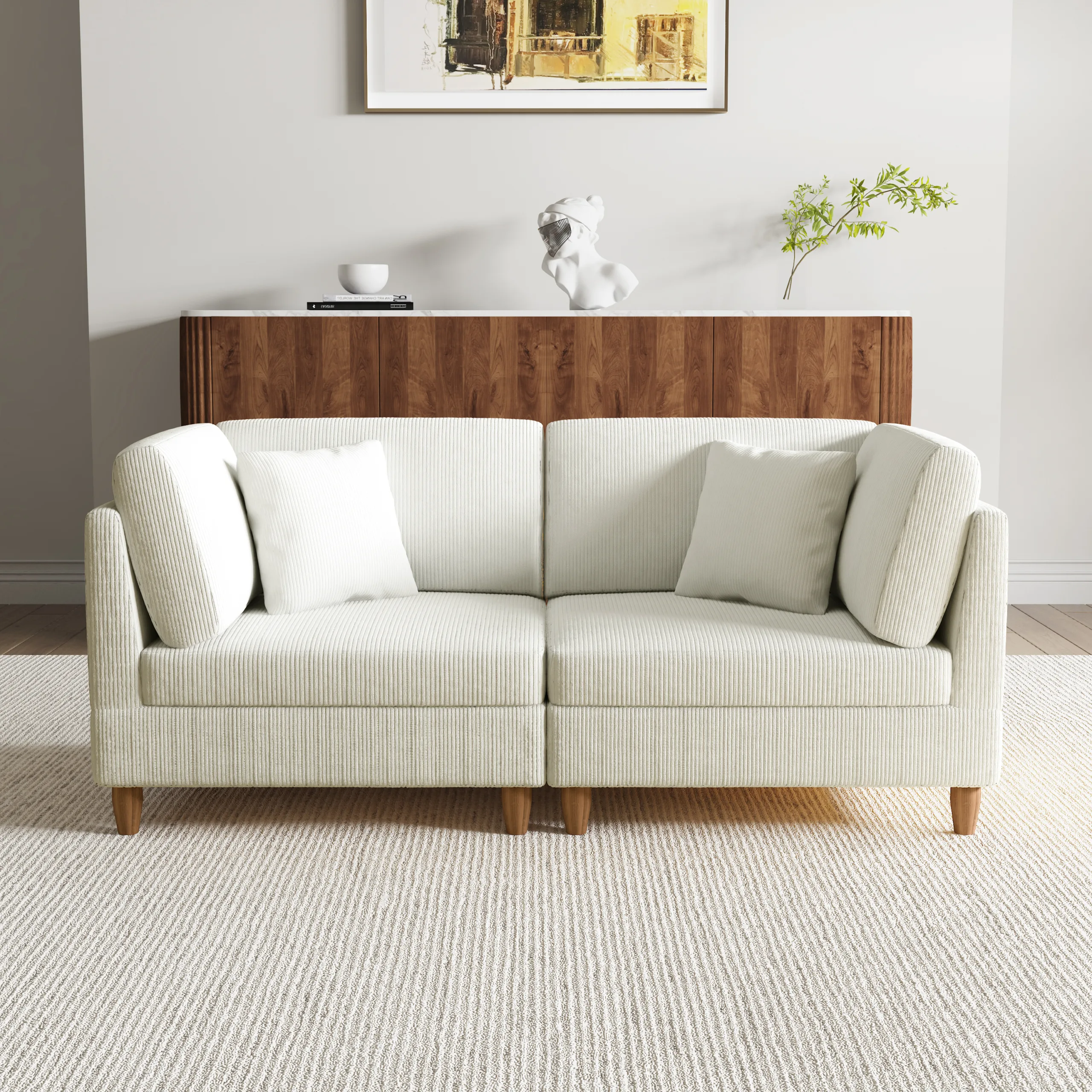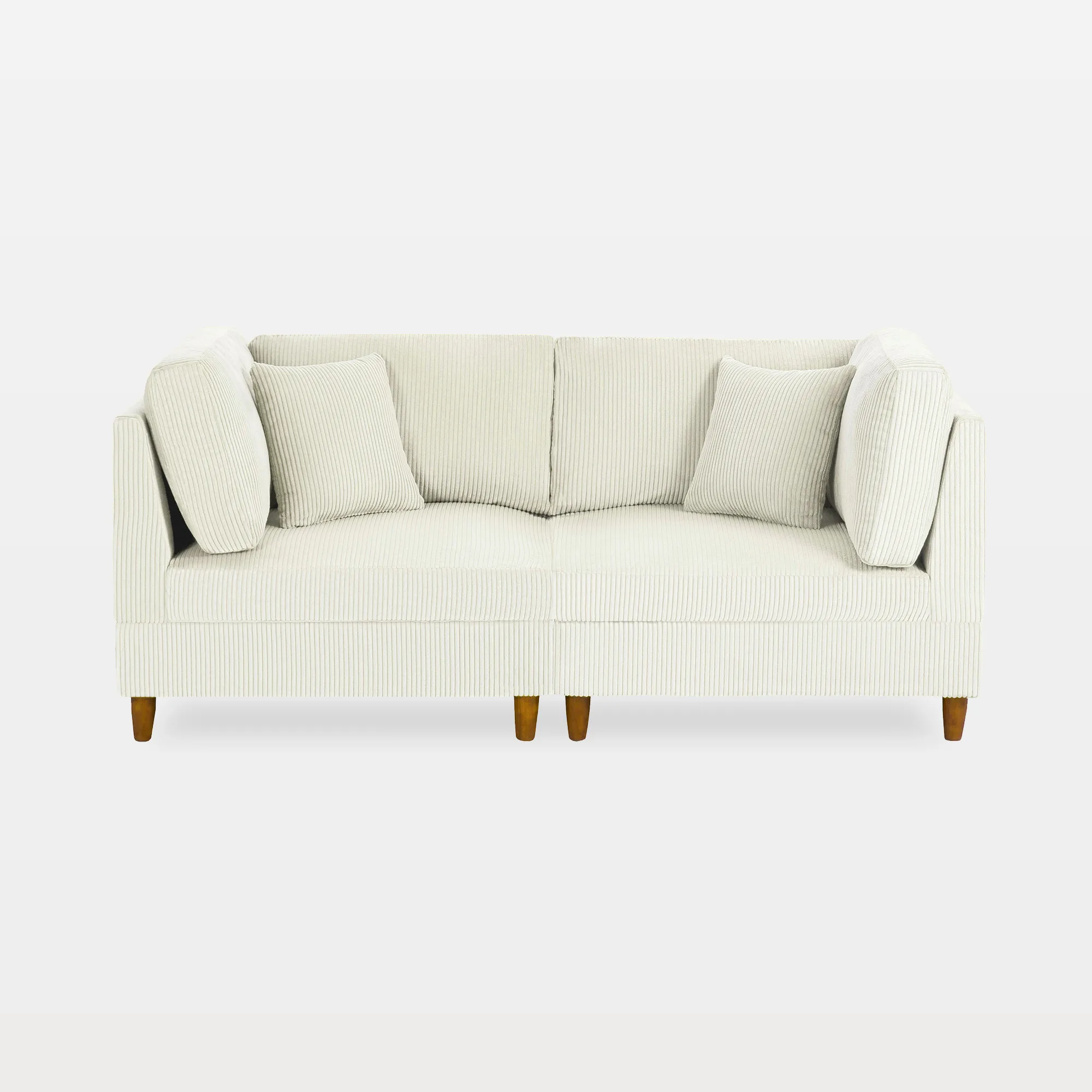 Bring home that easy Sunday feeling with our Hadlie 2-Seat Corduroy Modular Sofa with Peg Legs. Built from two one-arm corner chairs, it creates a cozy two-person nook while keeping the room feeling open. Slightly taller backs give your shoulders a steadier place to land, and each side comes with a back cushion, armrest cushion, and matching pillow for everyday comfort. Foam padding keeps the seats soft but steady, while corduroy ribs add warm, vintage texture you can spot across the room. Wooden peg legs lift the low profile so the space stays light. Choose S or M, and add the ottoman when you want extra stretch-out room.