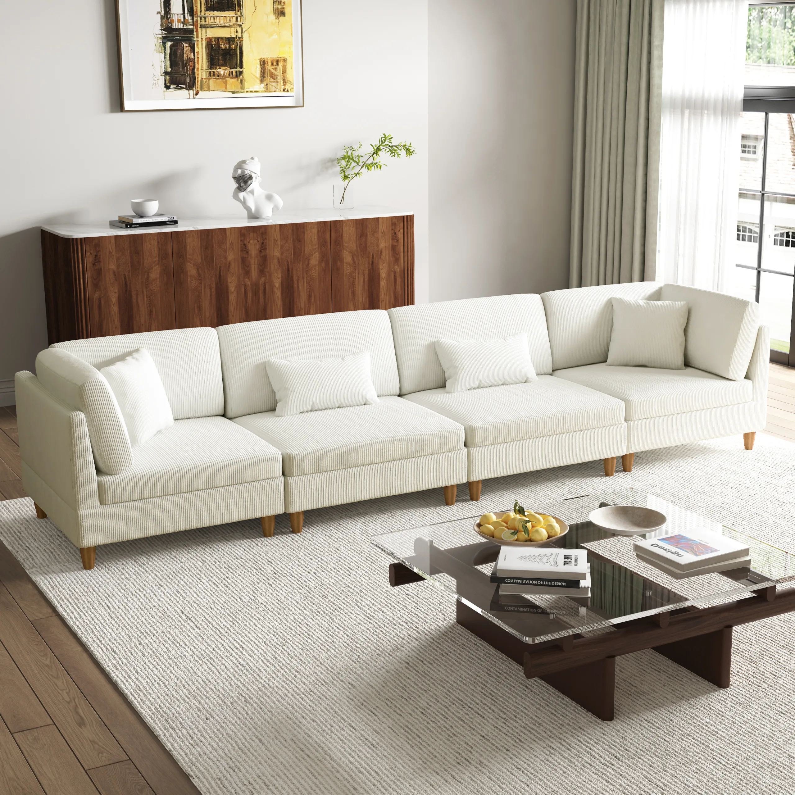 More seats, same easy vibe. Our Hadlie 4-Seat Corduroy Sectional Sofa with Peg Legs brings a longer, room-filling stretch with two one-arm corners and two armless middle seats, so there is space for family lounging, guests, and a little sprawl. The corners add slightly taller backs for shoulder support, while the armless center seats keep the silhouette clean and continuous. Foam padding and plush cushions stay soft but steady through movie marathons and casual catch-ups. Corduroy ribs add warm, vintage texture that looks inviting across the room. Finished with wooden peg legs, the low profile stays visually light and easy on the space. Pick S or M, and bring in the ottoman whenever you feel like stretching out.