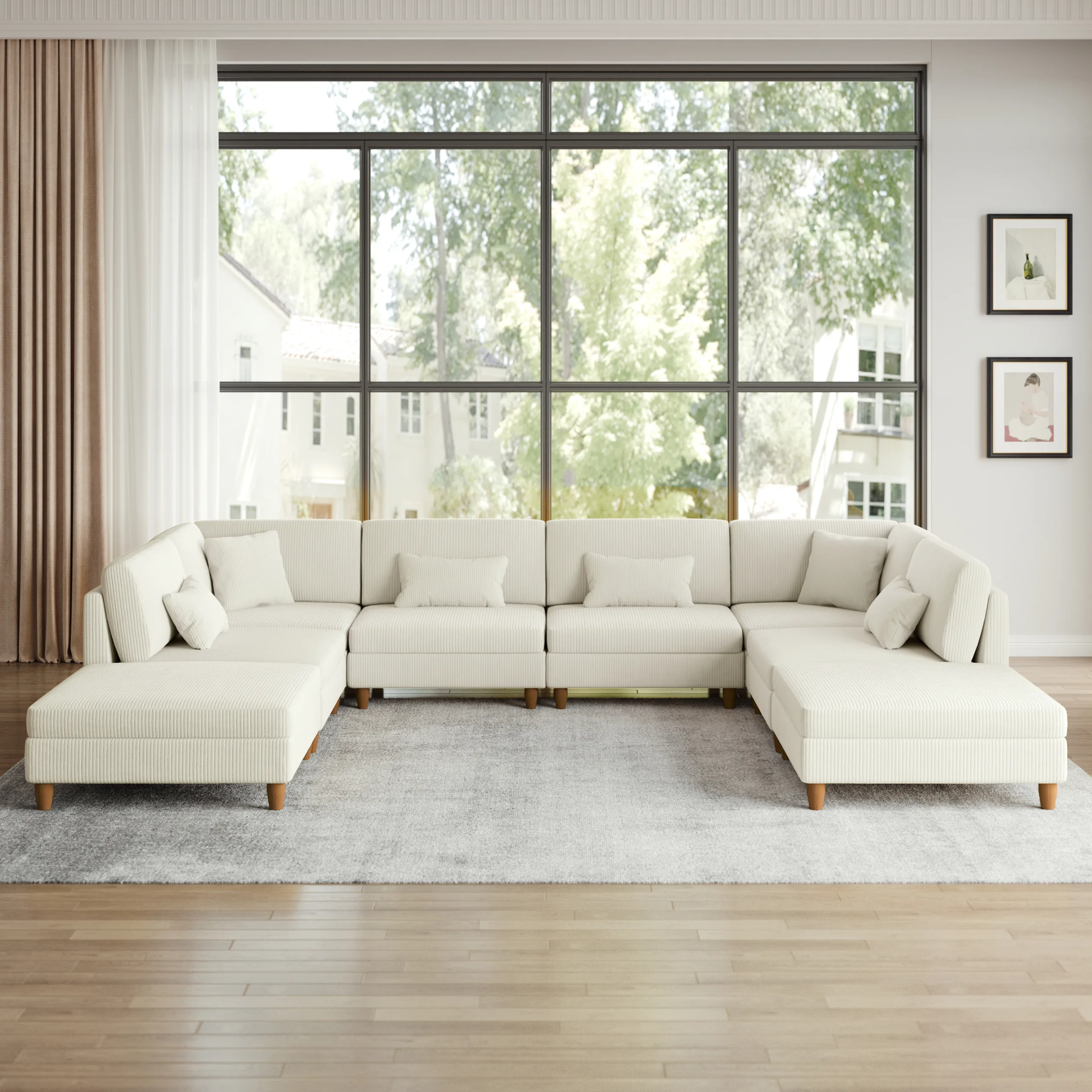 Make the living room the place everyone naturally piles into. Our Hadlie 6-Seat Corduroy Sectional Sofa with Peg Legs stretches wide with two one-arm corners, four armless seats, and two matching ottomans, so there is space for family movie nights, kids sprawled with blankets, and friends dropping in without a shuffle. The corners bring slightly taller backs for shoulder support, while the armless seats keep the long run looking clean and uninterrupted. Foam padding and plush cushions stay soft but steady, and corduroy ribs add warm, vintage texture that reads inviting across the room. Finished with wooden peg legs, the low profile stays visually light. Add the ottomans wherever you want extra feet-up space, an extra perch, or a tray moment.