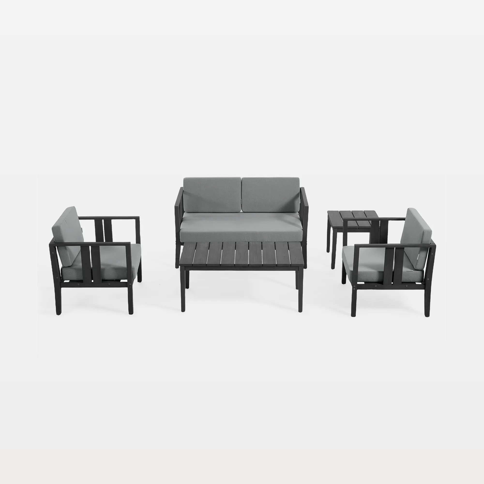 Weeknights start casual and end late on our Ilan 5-Piece Slatted Outdoor Patio Conversation Set with Tables. A loveseat and two armchairs seat four comfortably for tacos, trivia, or shared streaming sessions under string lights. The rectangular coffee table and square side table split the job of holding pitchers, serving boards, and small d??cor so laps stay open. Teak frames with slatted details keep the layout visually light while still feeling sturdy and grounded. Arrange everything in a loose circle, along a railing, or around an outdoor rug to turn your patio into the default meet-up spot all season.