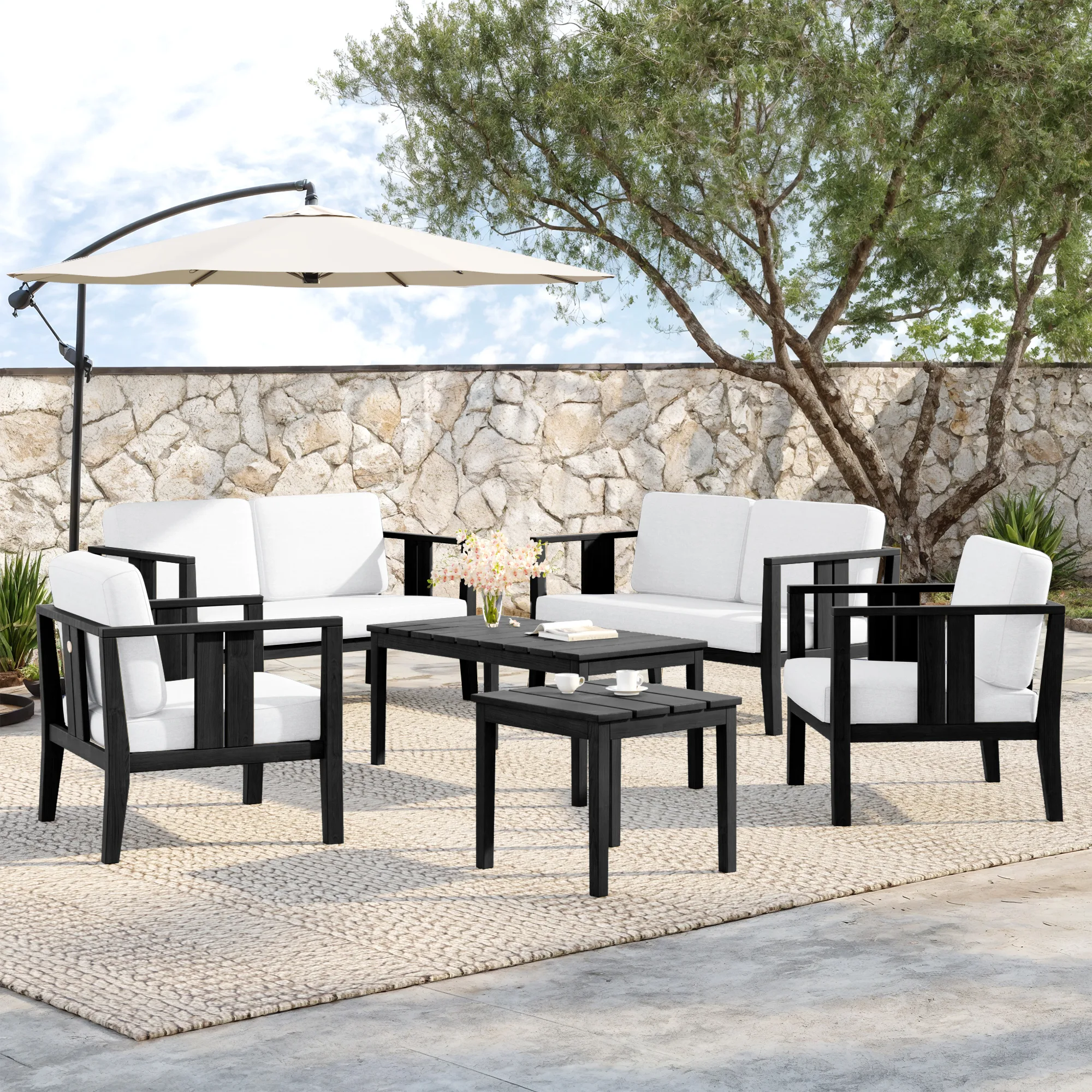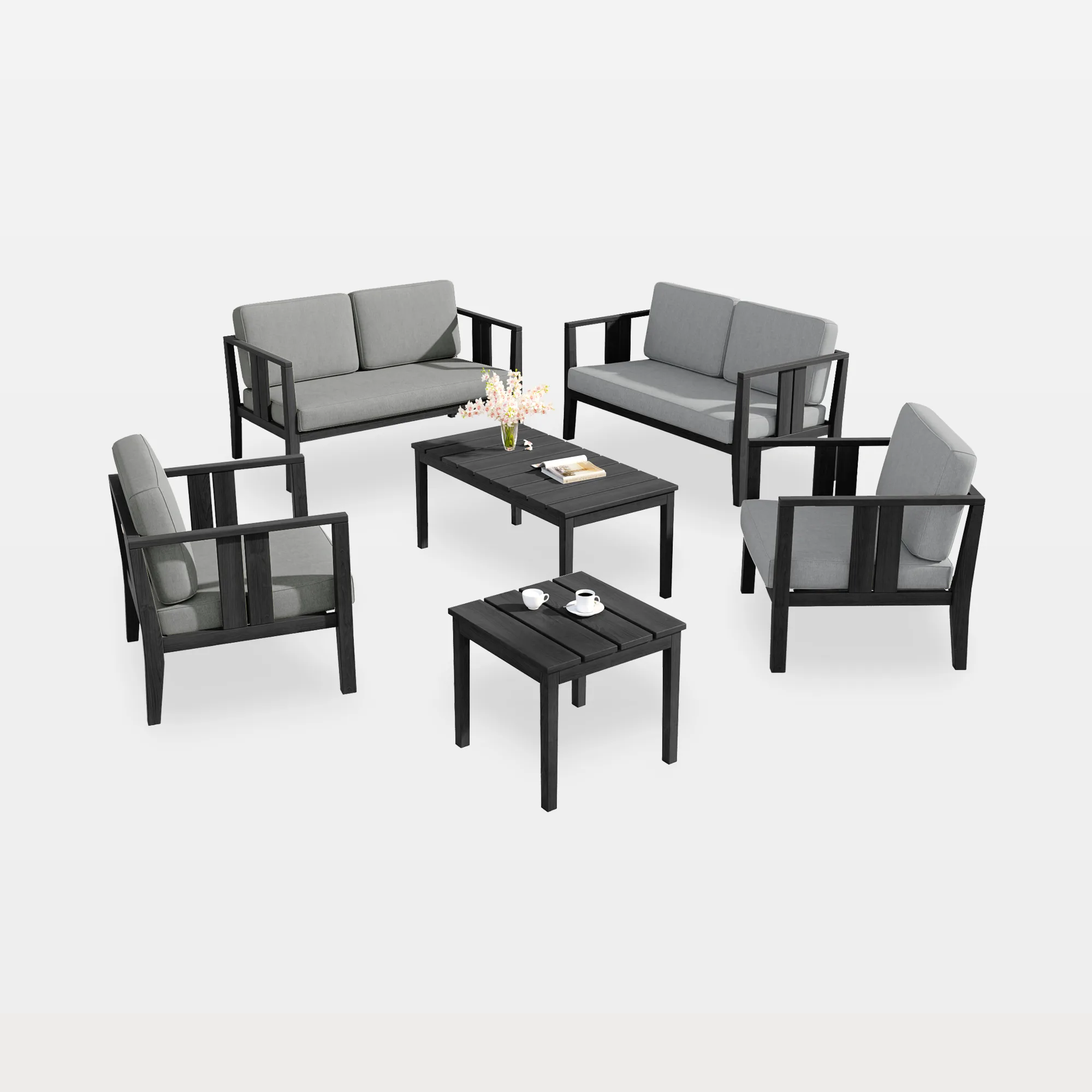 Includes two loveseats, two armchairs, one coffee table, and one side table for larger groups.