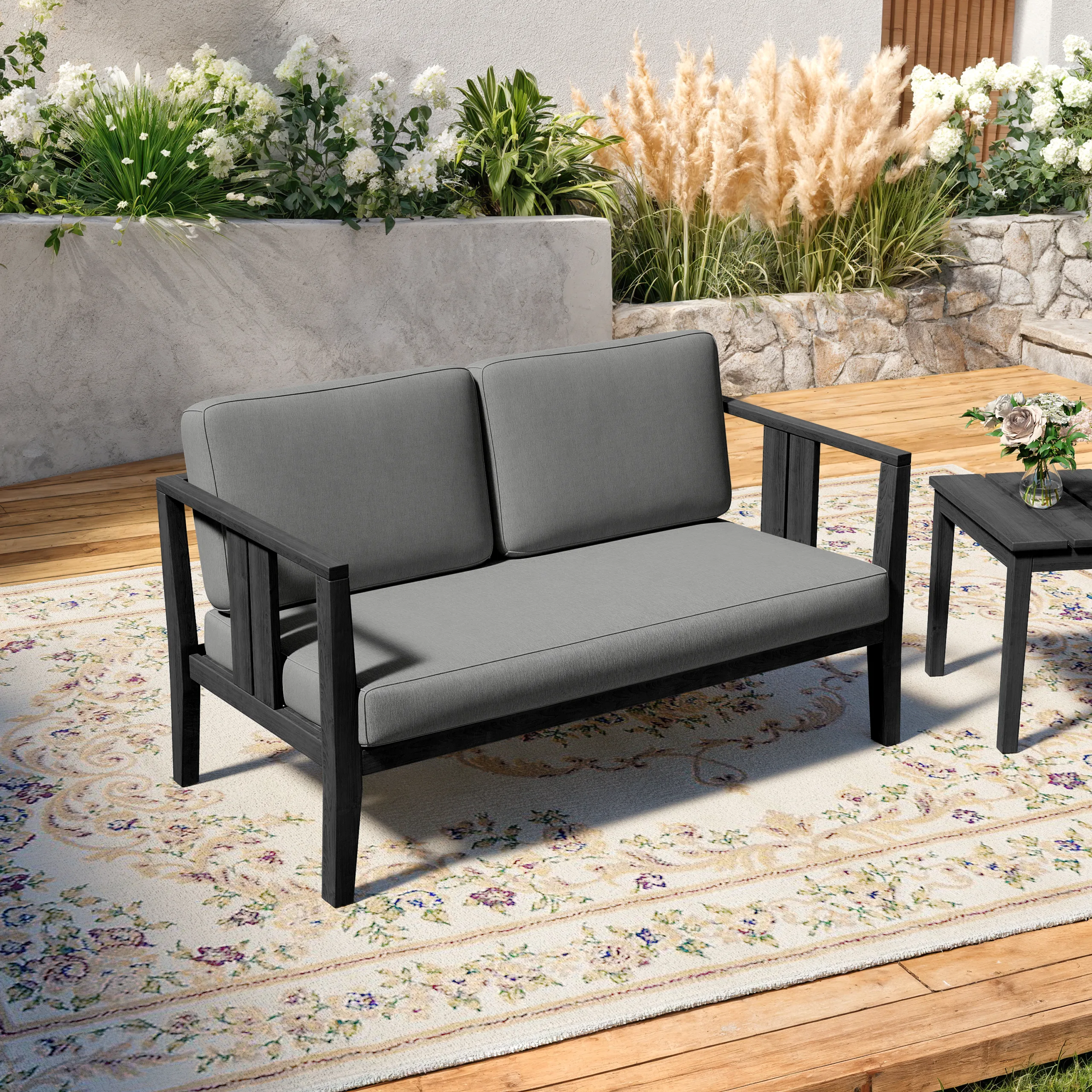 Includes one teak outdoor loveseat with cushioned seat and back sized for two people.