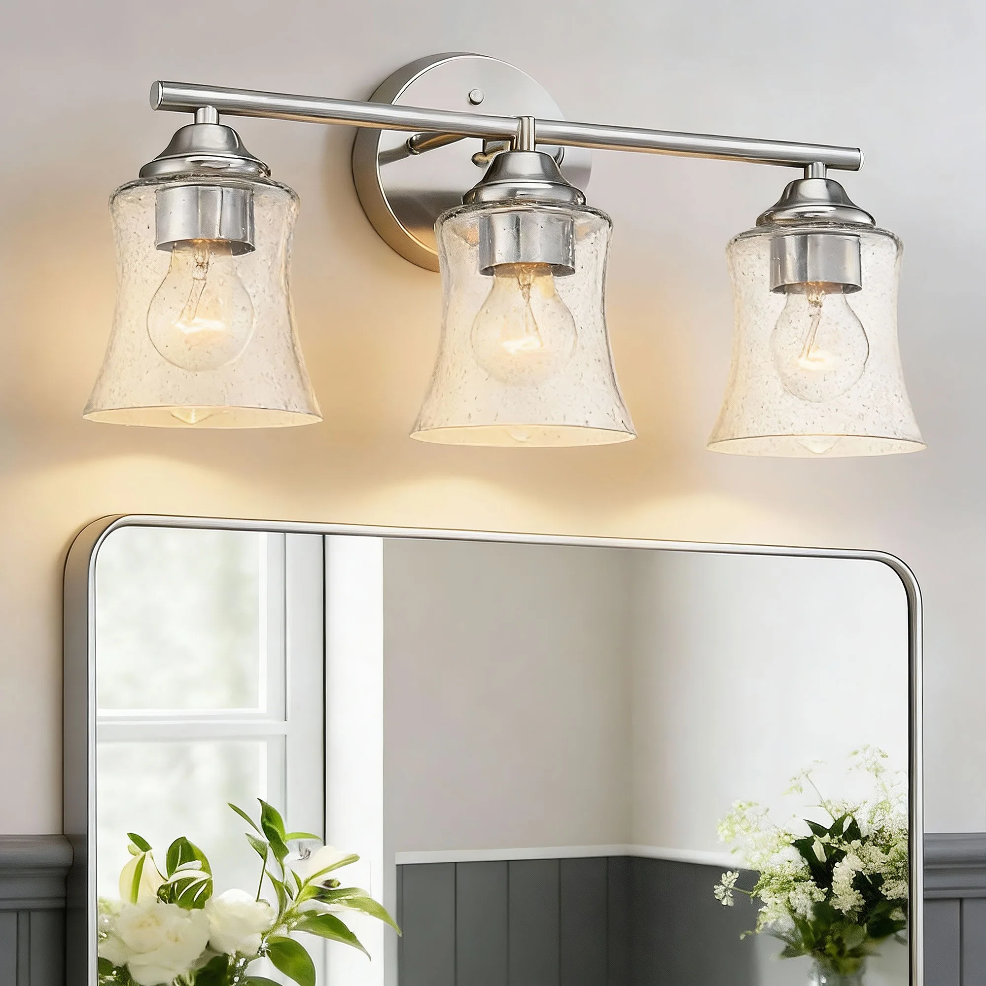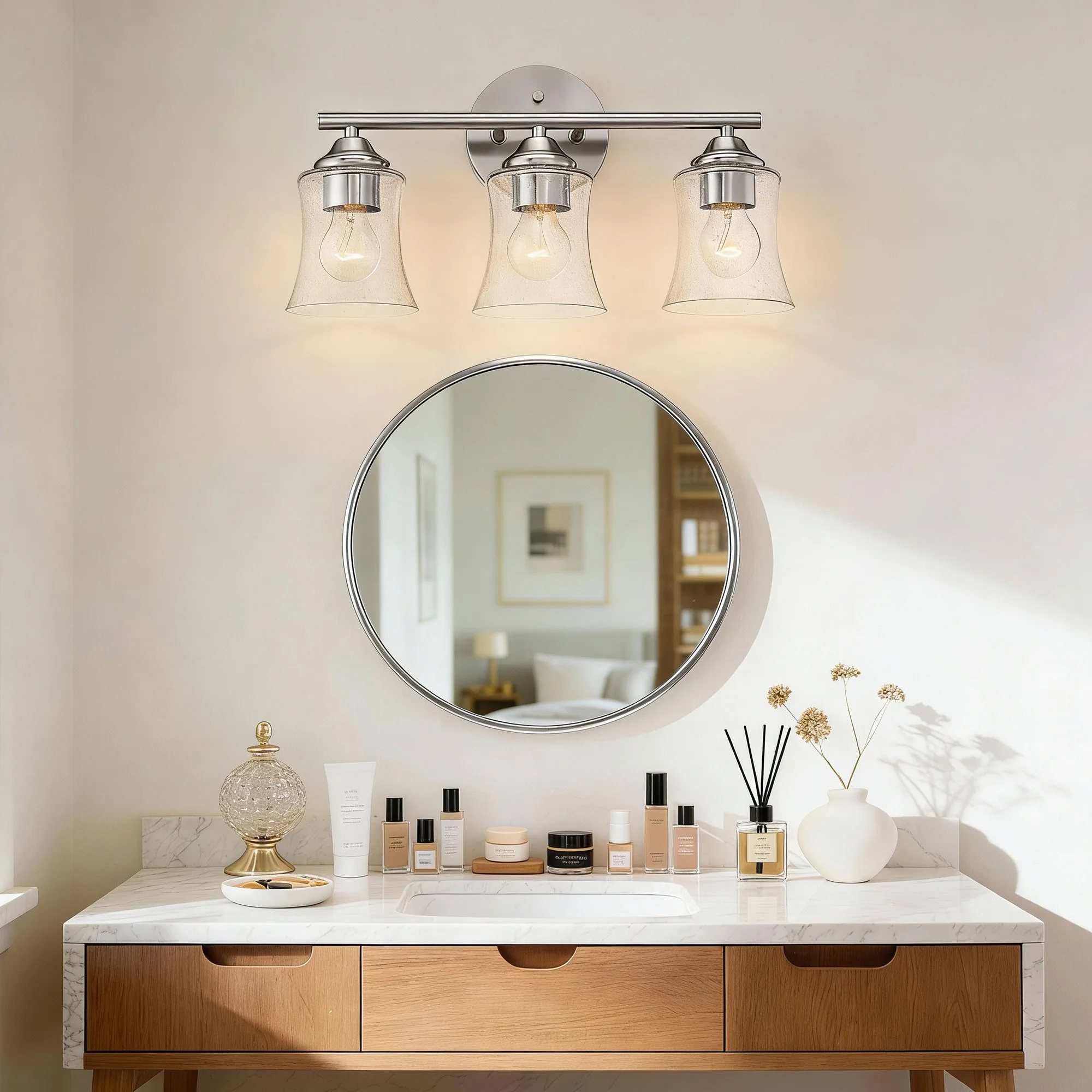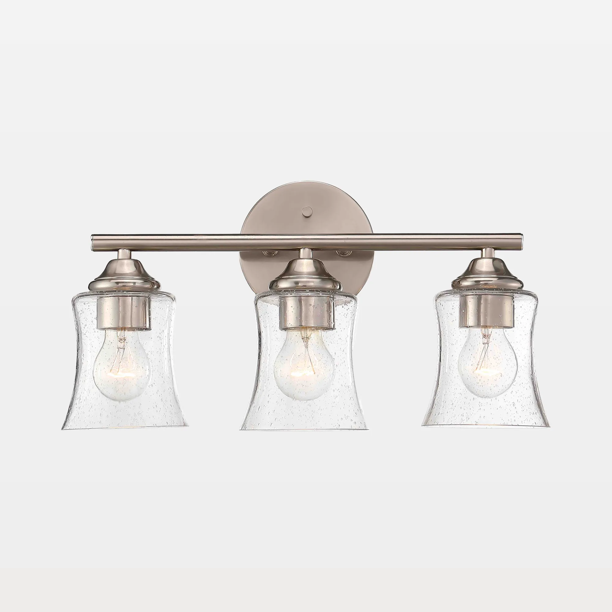 - Nickel lamp body combined with clear glass shades that gently diffuses light when the fixture is illuminated, add an elegant touch and different taste to your home. Update your bathroom with one easy step