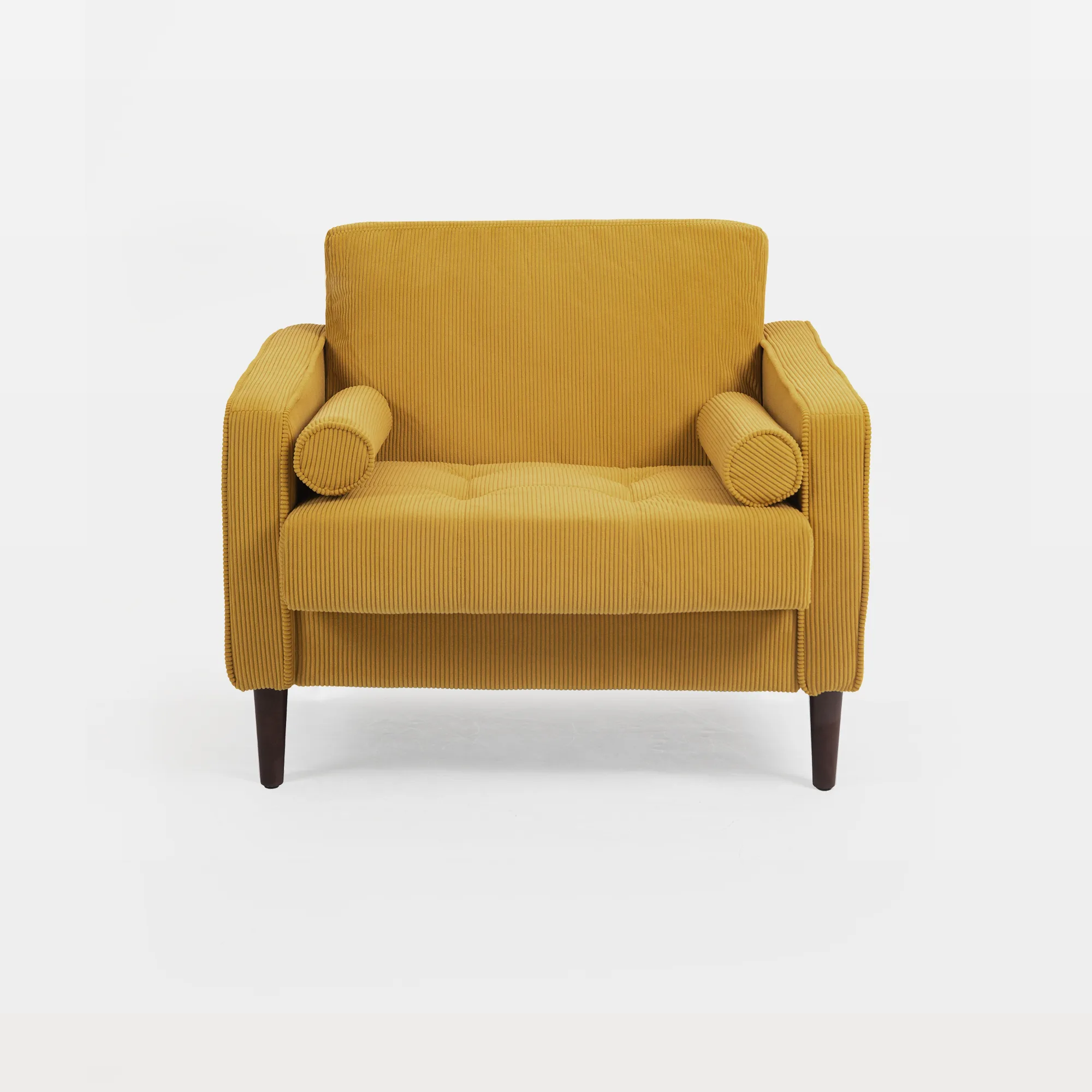 Ever want a curl-up spot that doesn’t take over the room? Our tufted corduroy armchair gives you that roomy seat depth, plus two cylindrical bolsters for easy lower-back support during long reads. Trying to warm up a home office that feels a little too stern? Set it near the desk as a soft break between calls. Corduroy stays quiet, and pocket-coil support helps the cushion stay springy through longer sits.