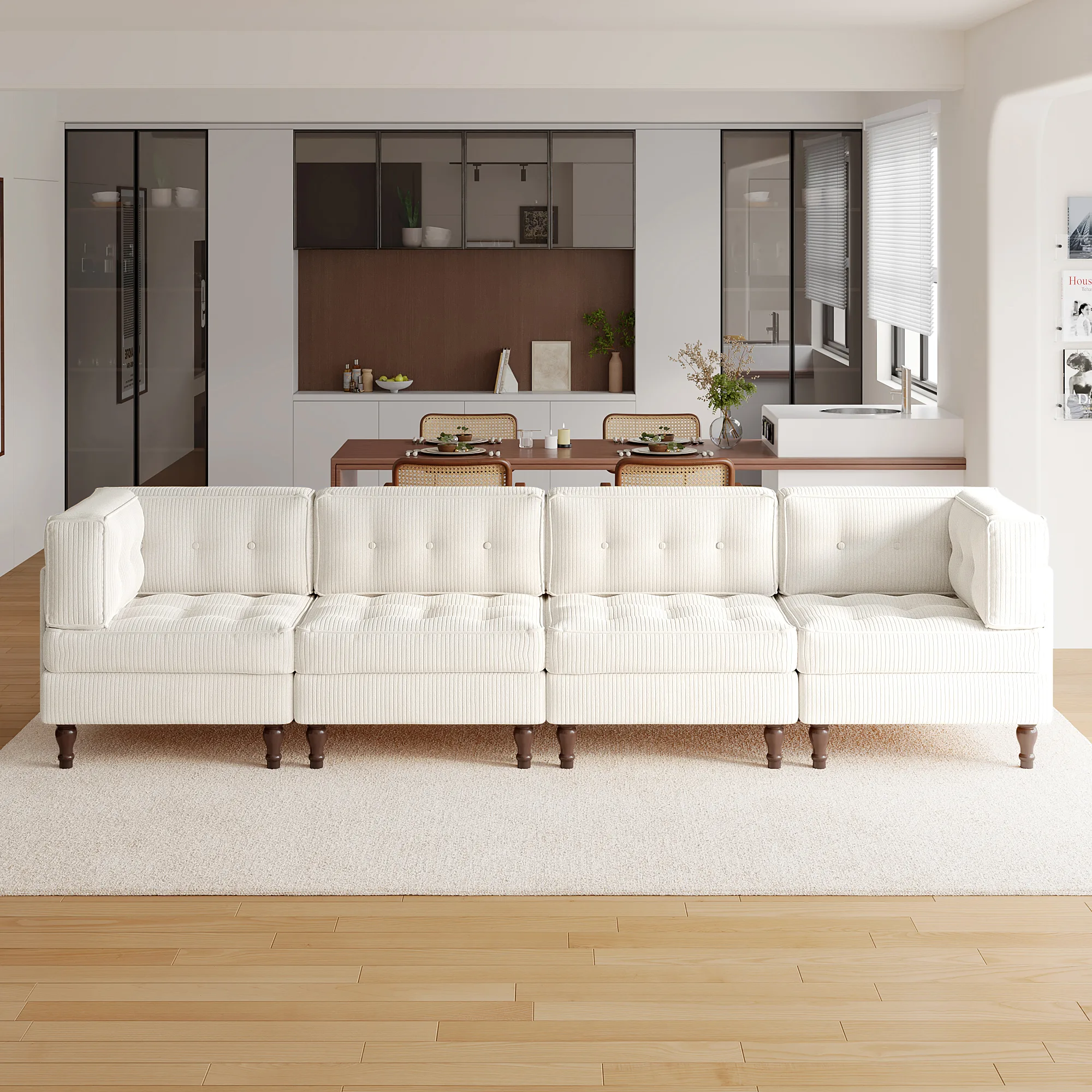 Open the floor for stories with our Junave 4-Piece Button Tufted Corduroy Sectional Sofa. Two corner chairs pair with two armless seats to welcome guests, games, and long talks at home. Piped trim sharpens the outline while button tufting brings gentle character and visual rhythm. Corduroy??s ridges deliver cozy handfeel that suits cooler seasons and everyday movie-night rituals. Find more Junave pieces to add ottomans, extend seating runs, and remix shapes as plans evolve.