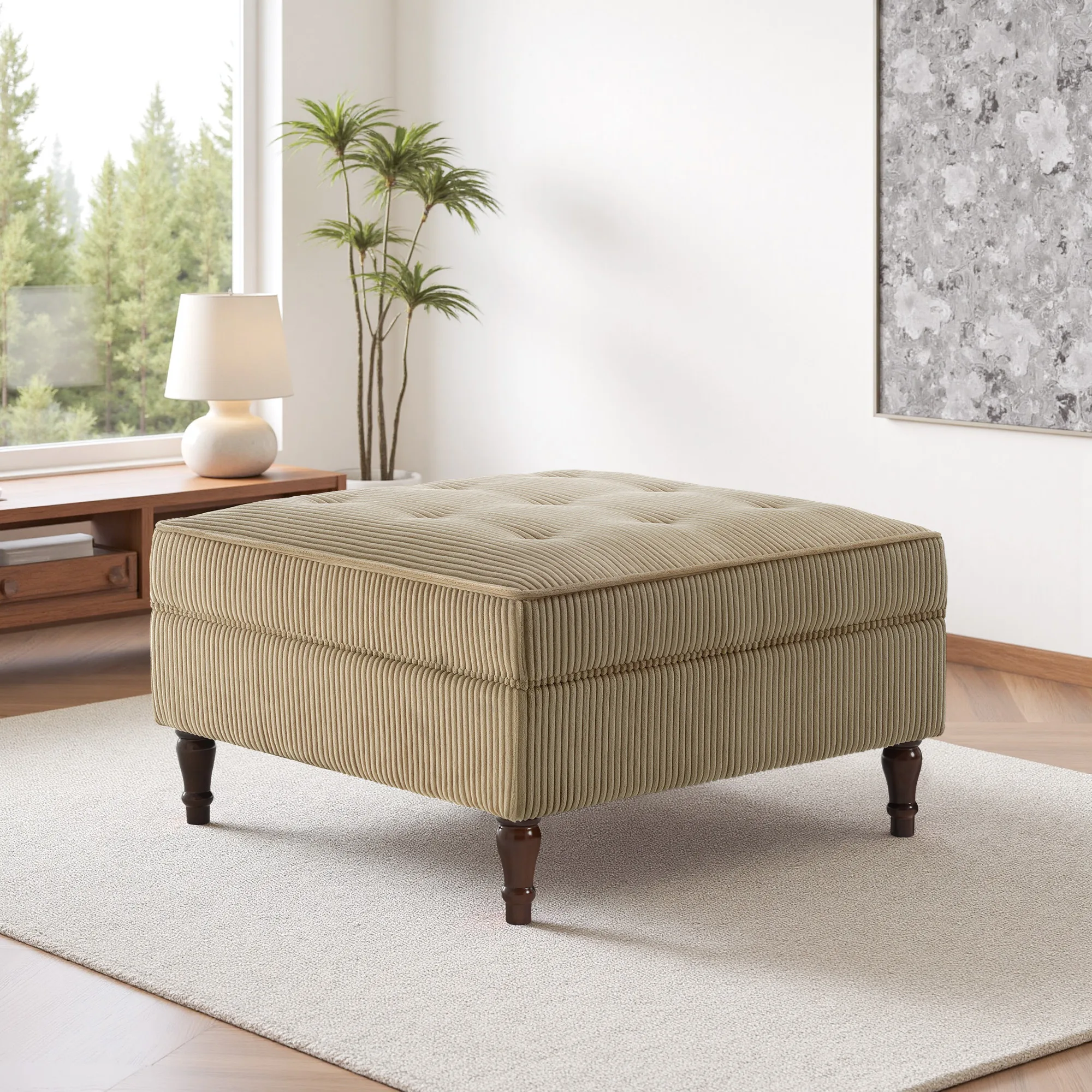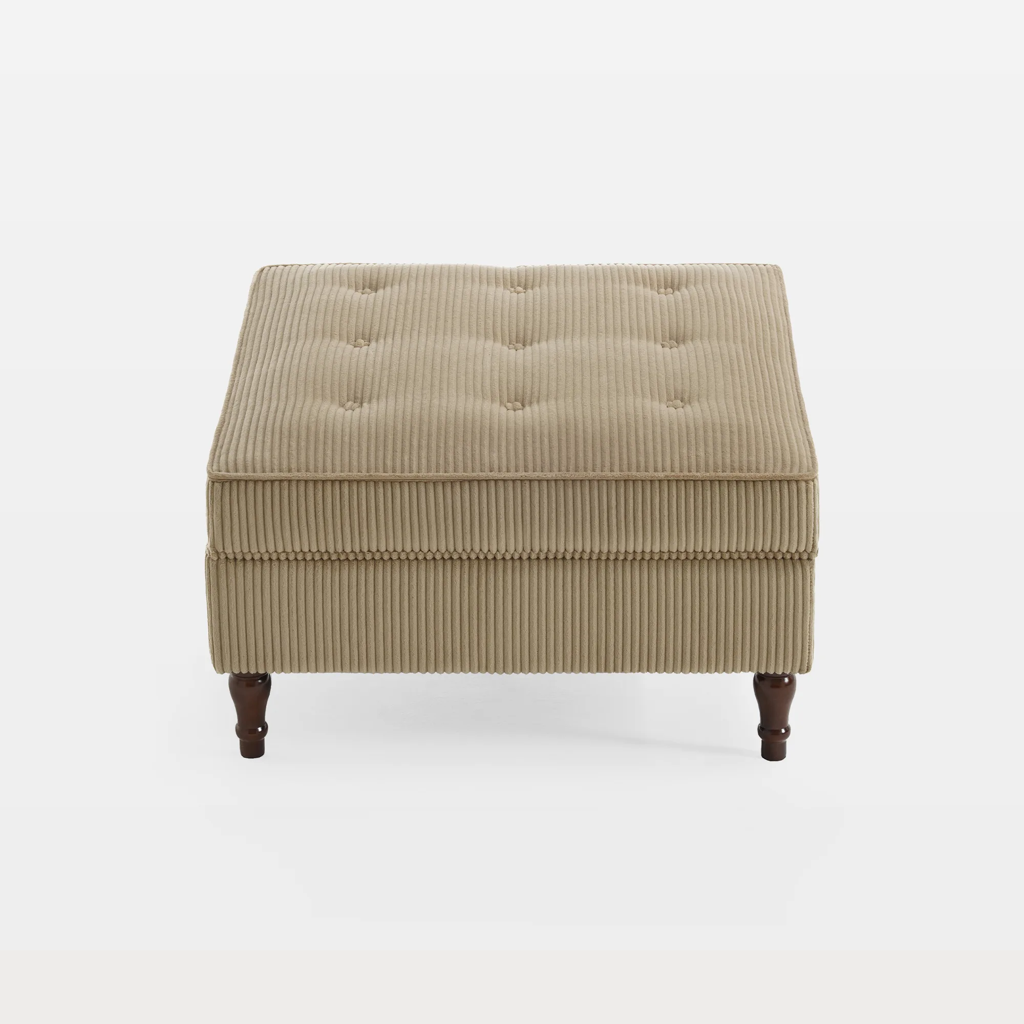 · Includes one button tufted corduroy storage ottoman with flip-top tray lid and wooden legs.
