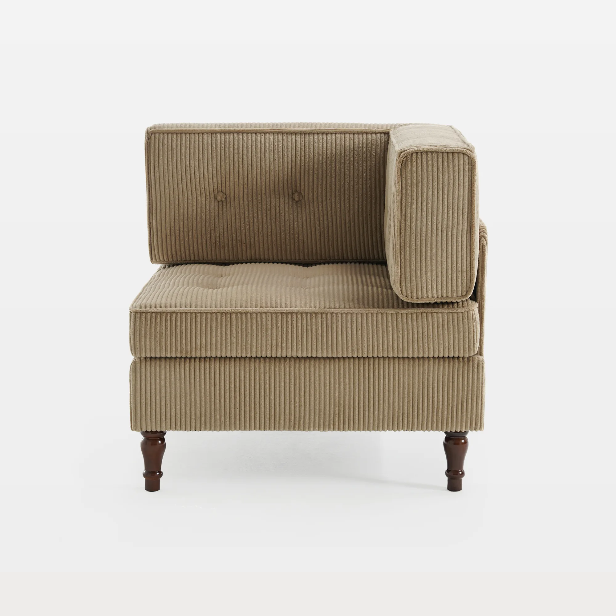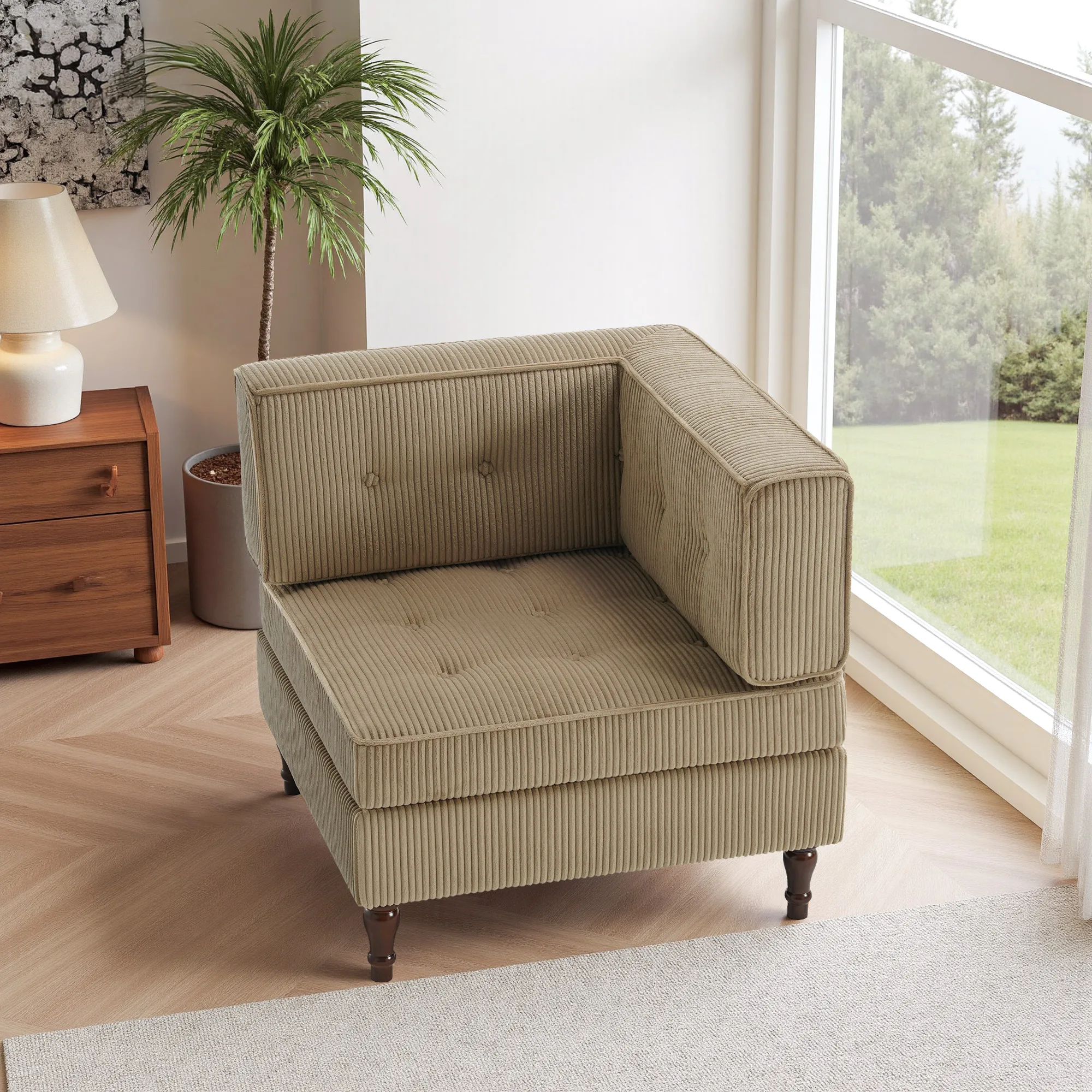 Shape a corner that feels both classic and open with our Junave Single Arm Button Tufted Corduroy Corner Chair. Set it at the end of a sofa to create a relaxed chaise feel, or use it as the turning point of a Junave sectional. Its ribbed corduroy upholstery, button-tufted seat, and piped edges bring tailored detail to everyday lounging. Foam and fiber cushioning keep the sit comfortable from quick check-ins to long conversations. Combine this corner chair with matching Junave ottomans and armless modules to build anything from a quiet reading nook to a full sectional tailored to your space.