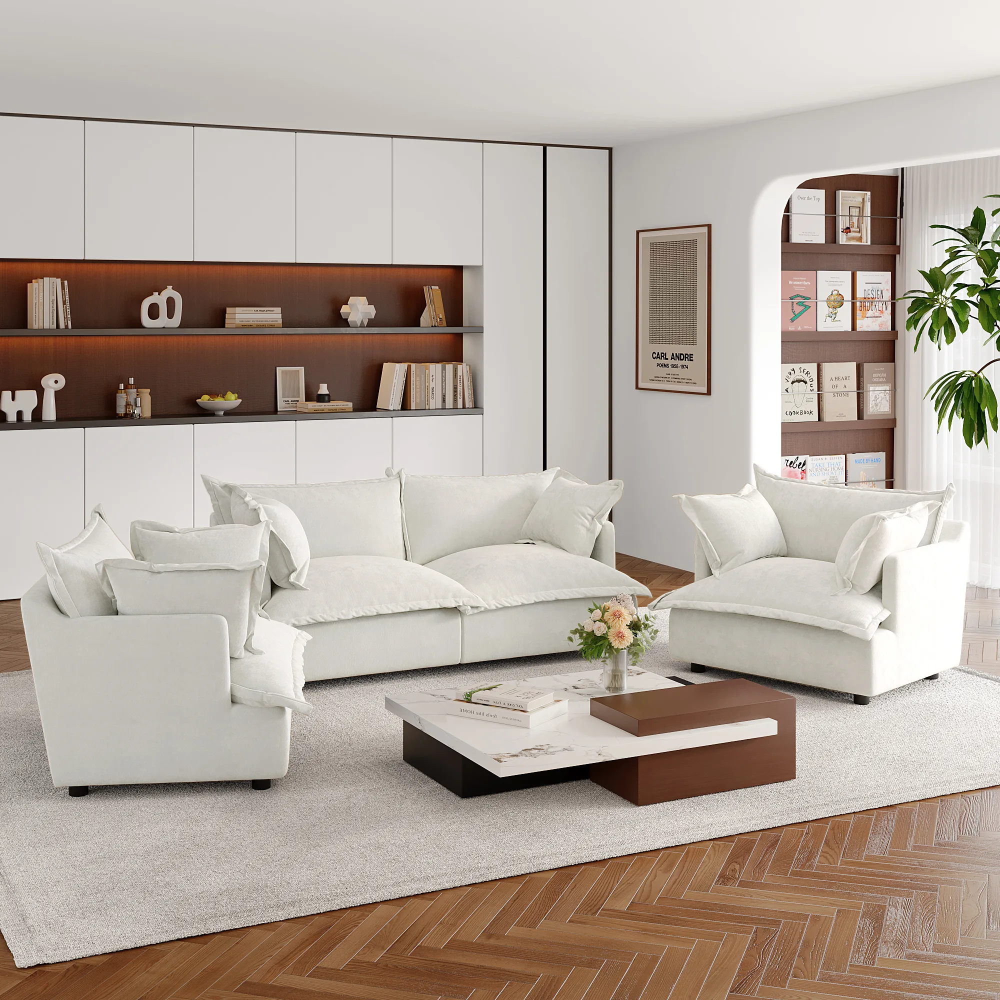 Room for friends, room for stretch with our Lione 4-Piece Flange Edge Chenille Sectional Sofa. Two corner modules join two single chairs to shape a generous, deep-seat conversation zone for weekends. Flange edges trace every back, seat, and arm cushion, bringing relaxed polish and texture. Skin-friendly chenille and overstuffed support rest on solid wood frames with sturdy legs for reliability. Add ottomans or other Lione modules anytime to expand seating and reconfigure layouts for gatherings.