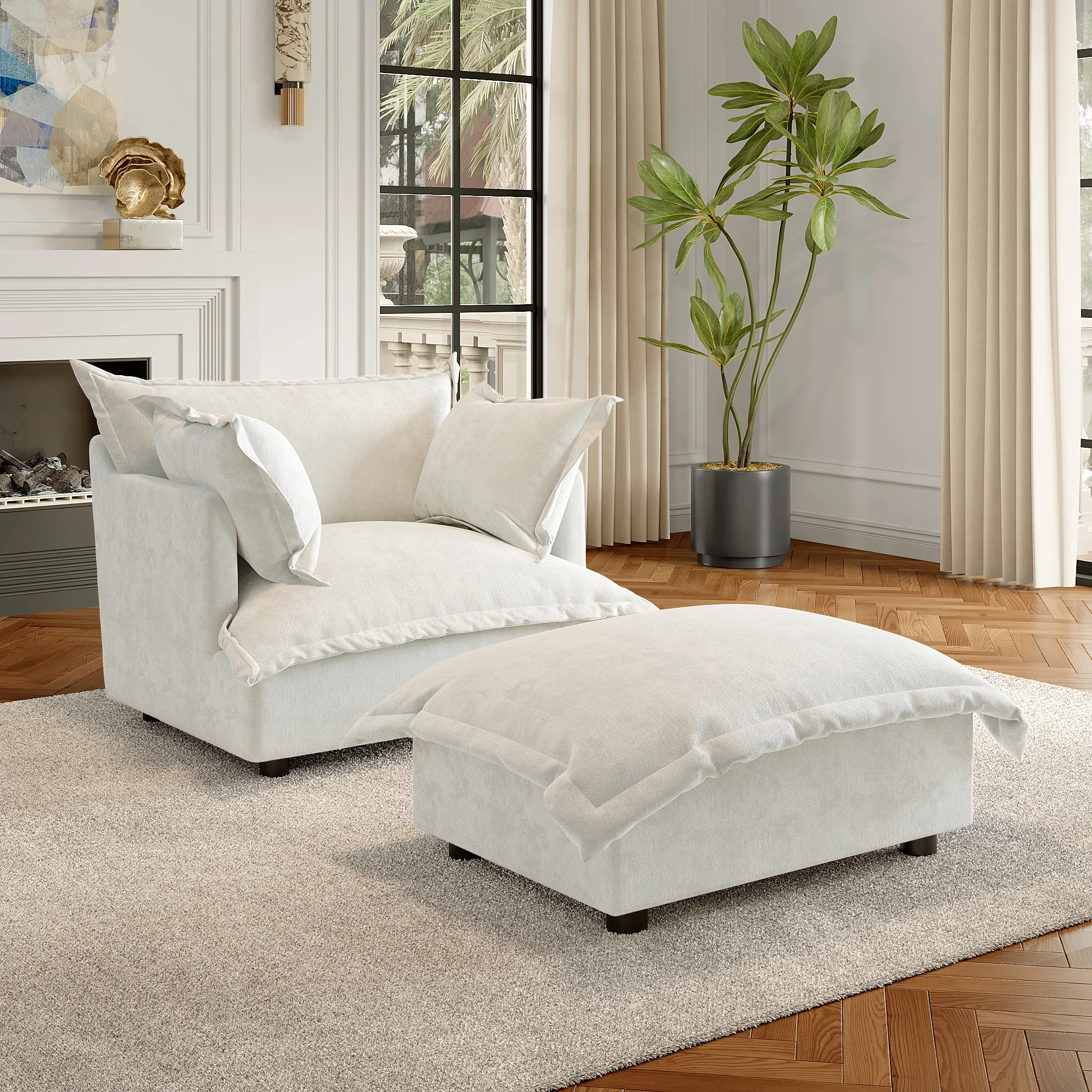 Call dibs on me-time with our Lione Flange Edge Chenille Single Sofa Chair with Ottoman. Together they create an easy chaise stretch for reading, journaling, or restorative afternoon naps at home. Flange edges frame back, seat, arms, and ottoman cushions with relaxed, tailored character. Warm chenille and overstuffed comfort settle on solid wood frames with sturdy legs for dependable stability. Explore more Lione modules to expand seating, reshape corners, and build layouts that match your routine.