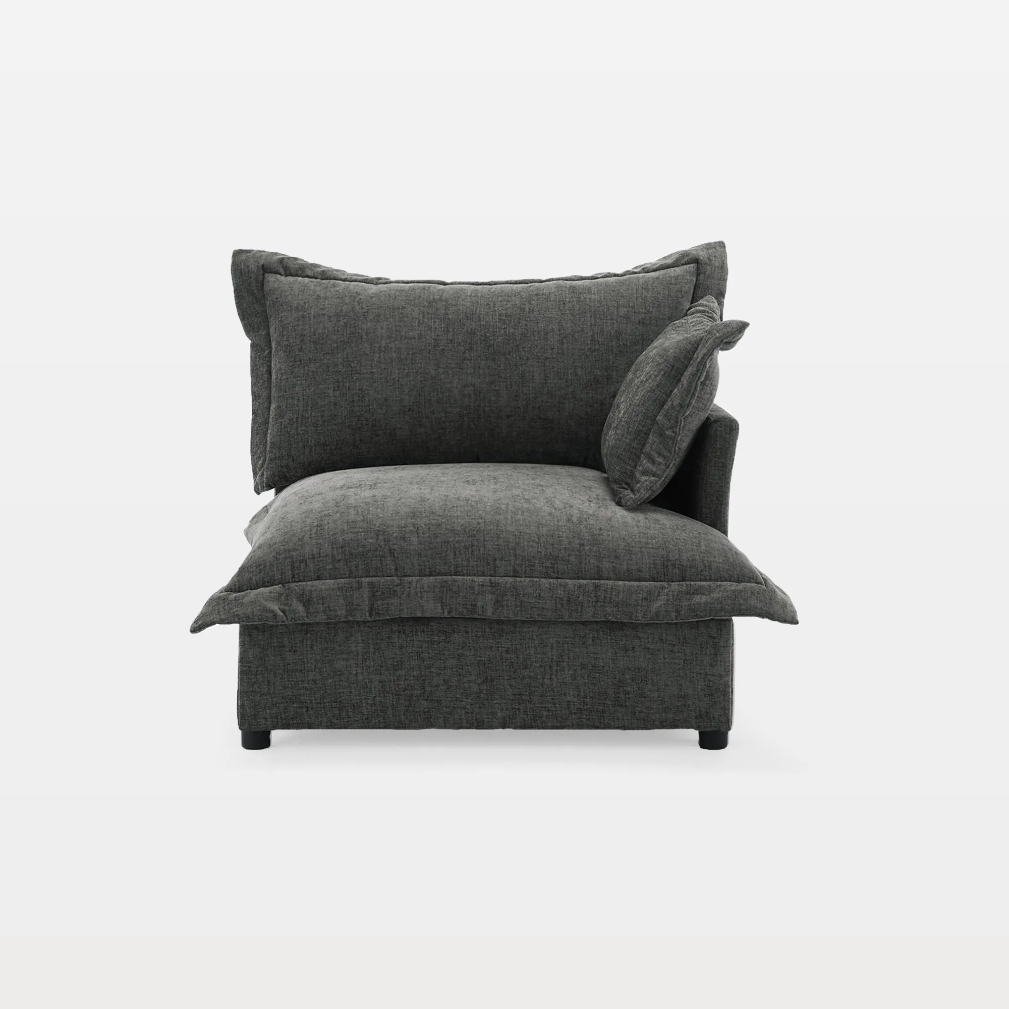 Lean into the easy angle of comfort with our Lione Flange Single Arm Modular Chenille Corner Chair. An overstuffed back and deep seat relax the body, while a single arm keeps lounging open. Skin-friendly chenille wraps the cushions, and refined flange edges frame the back, seat, and single-arm cushion. A solid wood frame with sturdy legs keeps everything steady for reading, streaming, and gatherings. Explore other Lione modules to mix and match layouts and build the corner or sofa you need.