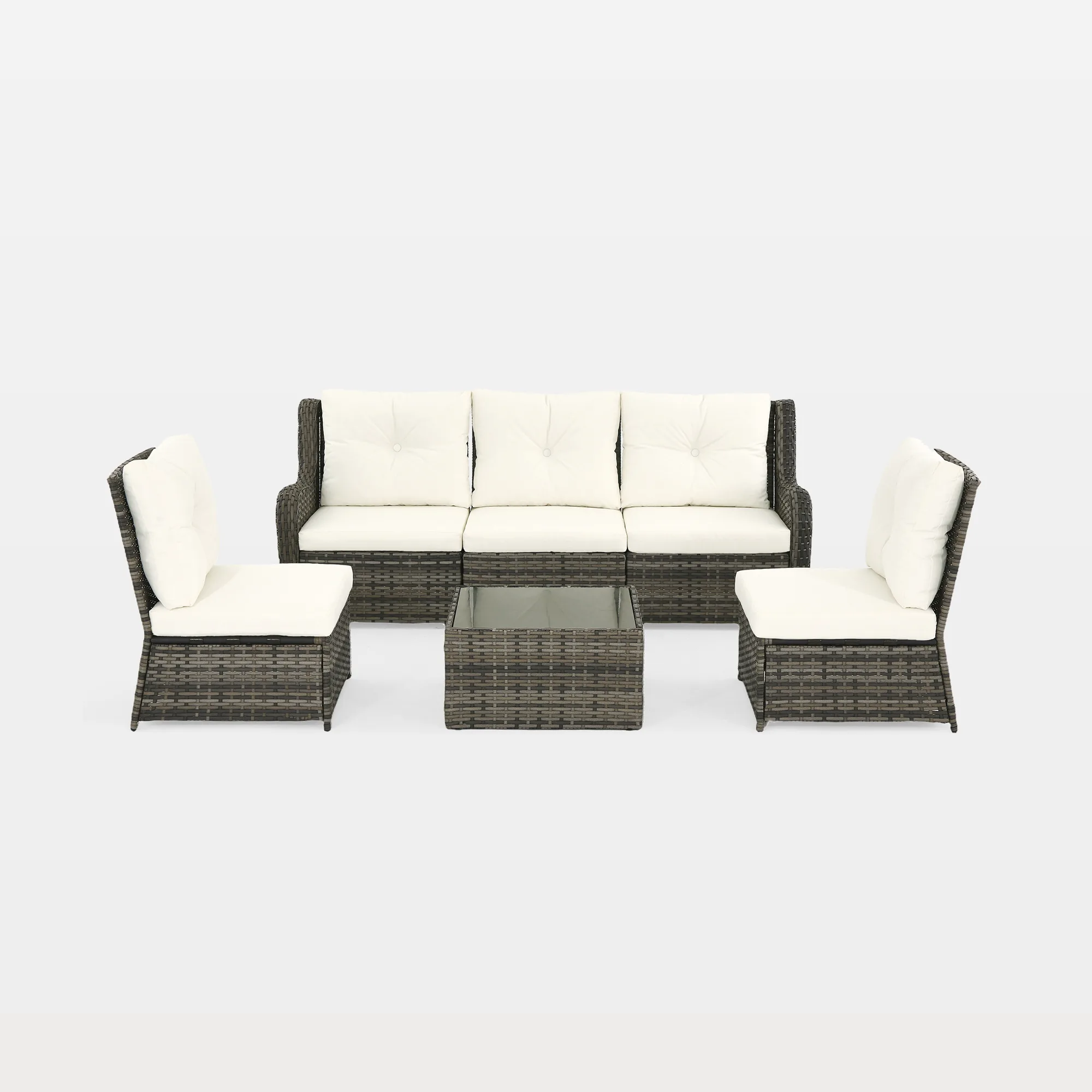 Sunny days call for seats that feel like a getaway. Our Marlie 6-Piece PE Wicker Cushioned Outdoor Patio Set with Table includes three armless chairs, two single-arm chairs, and a tempered-glass coffee table, so you can build a sofa, split into seats, or mix both. Choose a lighter wicker weave or a deeper, darker tone, both handwoven in water-resistant PE wicker over powder-coated steel frames. Curved armrests add a comfortable perch, and each back cushion features a single button tuft for a tidy look. The tempered glass table top wipes clean fast after snacks and drinks, keeping outdoor time calm, comfortable, and pulled together.