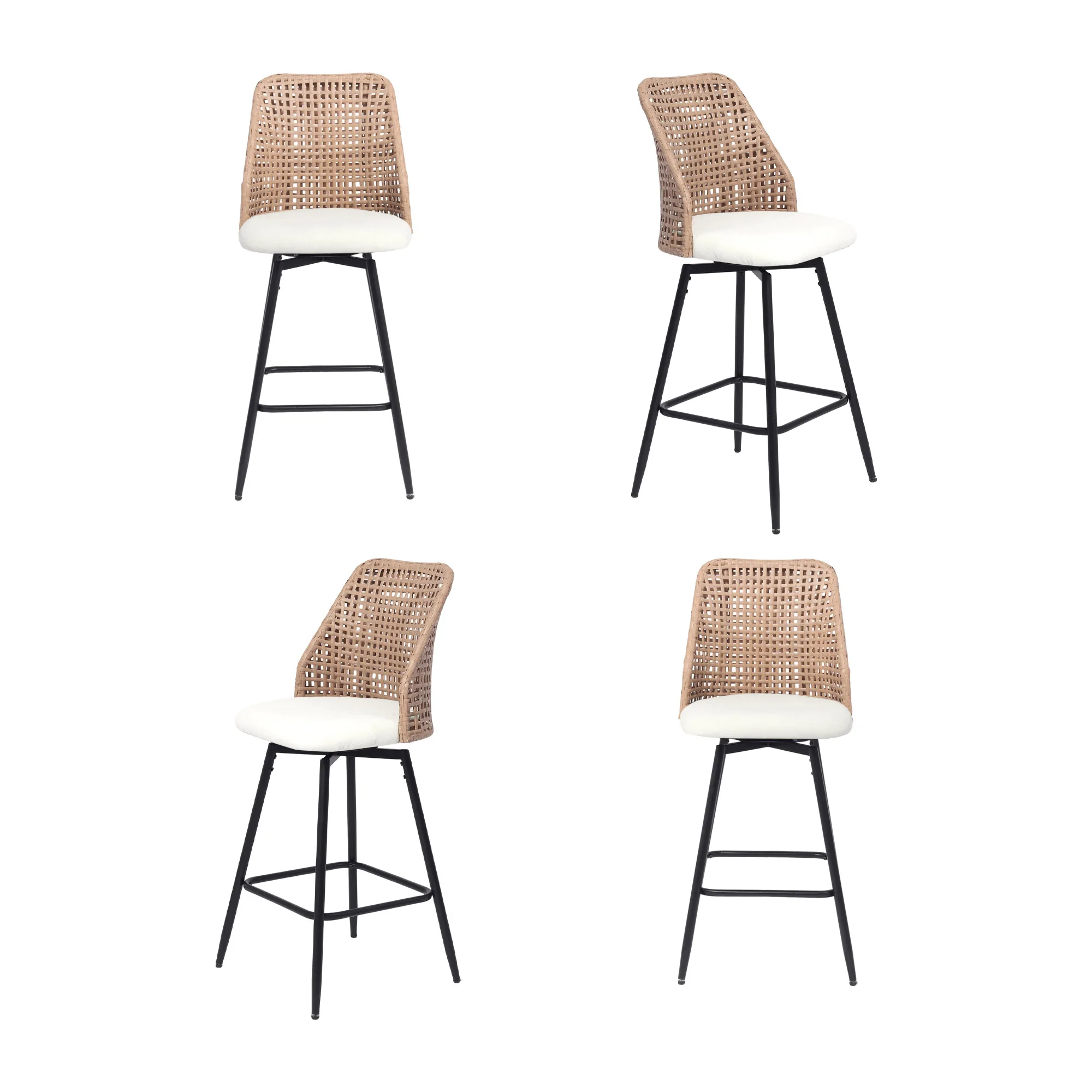 Turn casual nights into coastal bar time with our Olivay Wicker Swivel Upholstered Bar Stools Set of 4. The mid-height backs feature a wicker-style weaving technique that brings relaxed, beach-inspired texture without feeling heavy. Chenille seats with foam cushioning keep every perch soft and supportive at 28.7 inches high. A smooth 360-degree swivel lets you turn toward the cook, the conversation, or the TV in one easy move. Slim metal legs, a square footrest, and adjustable levelers help all four stools sit steady and comfortable.