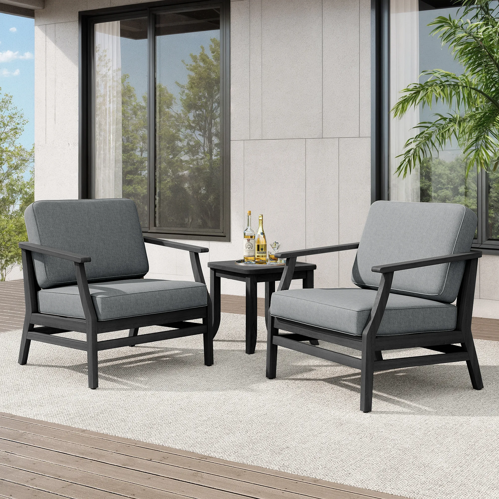 Includes 2 teak armchairs and 1 square side table for covered porch lounging.