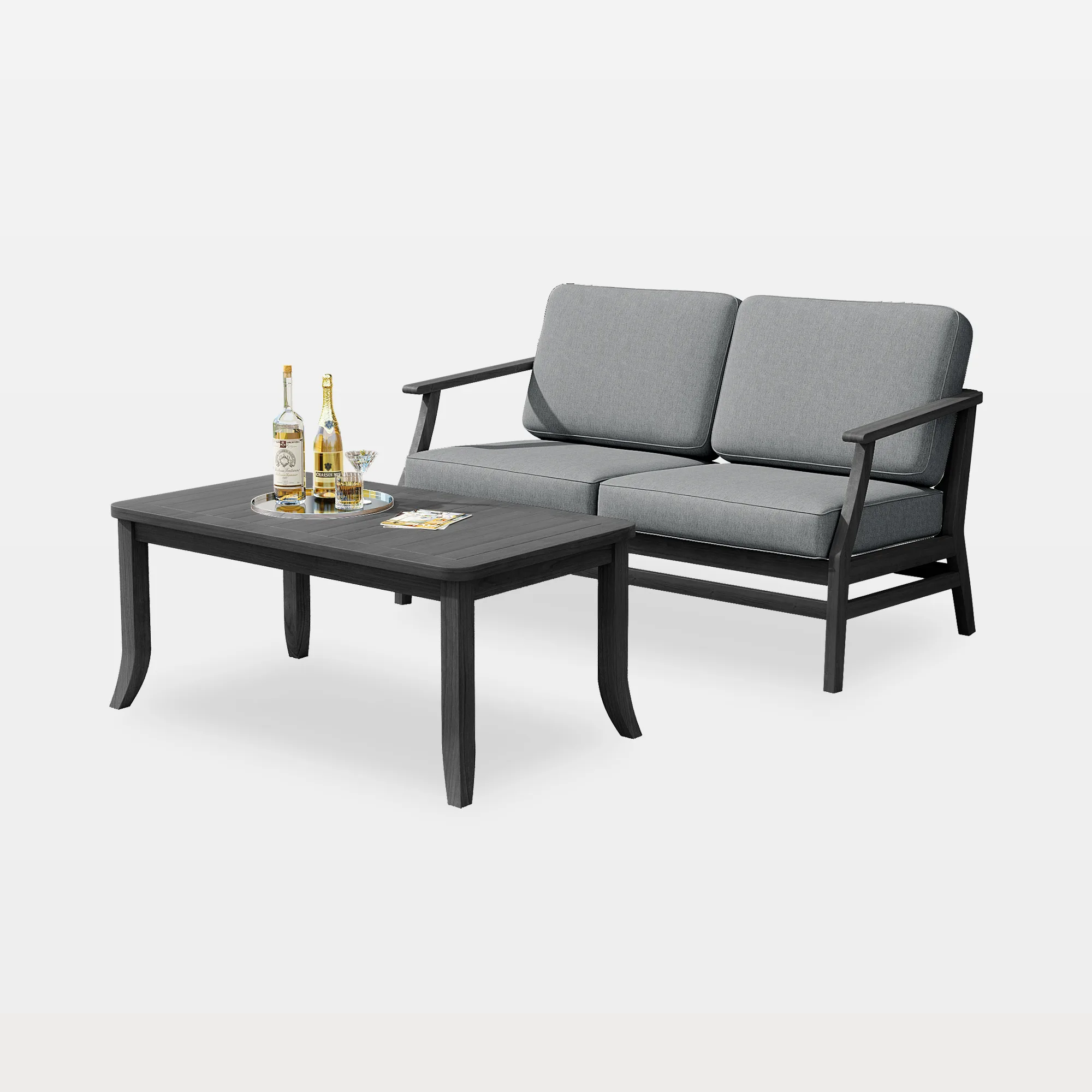 Take a seat under the covered porch and let the afternoon unfold. Our Otise Outdoor Patio Loveseat with Grooved Teak Coffee Table is made for sunrooms, screened porches, and deep covered patios where you want comfort without the heavy look. The loveseat keeps the profile open with a slatted back, then adds separate seat and back cushions for an easy, sink-in sit. In front, the rectangular teak top is grooved for a faux-slat look that wipes clean in one pass. Set down drinks, a snack spread, a book stack, or a puzzle board. The whole pairing reads rustically elegant, and it makes your sheltered outdoor space feel lived-in and welcoming.