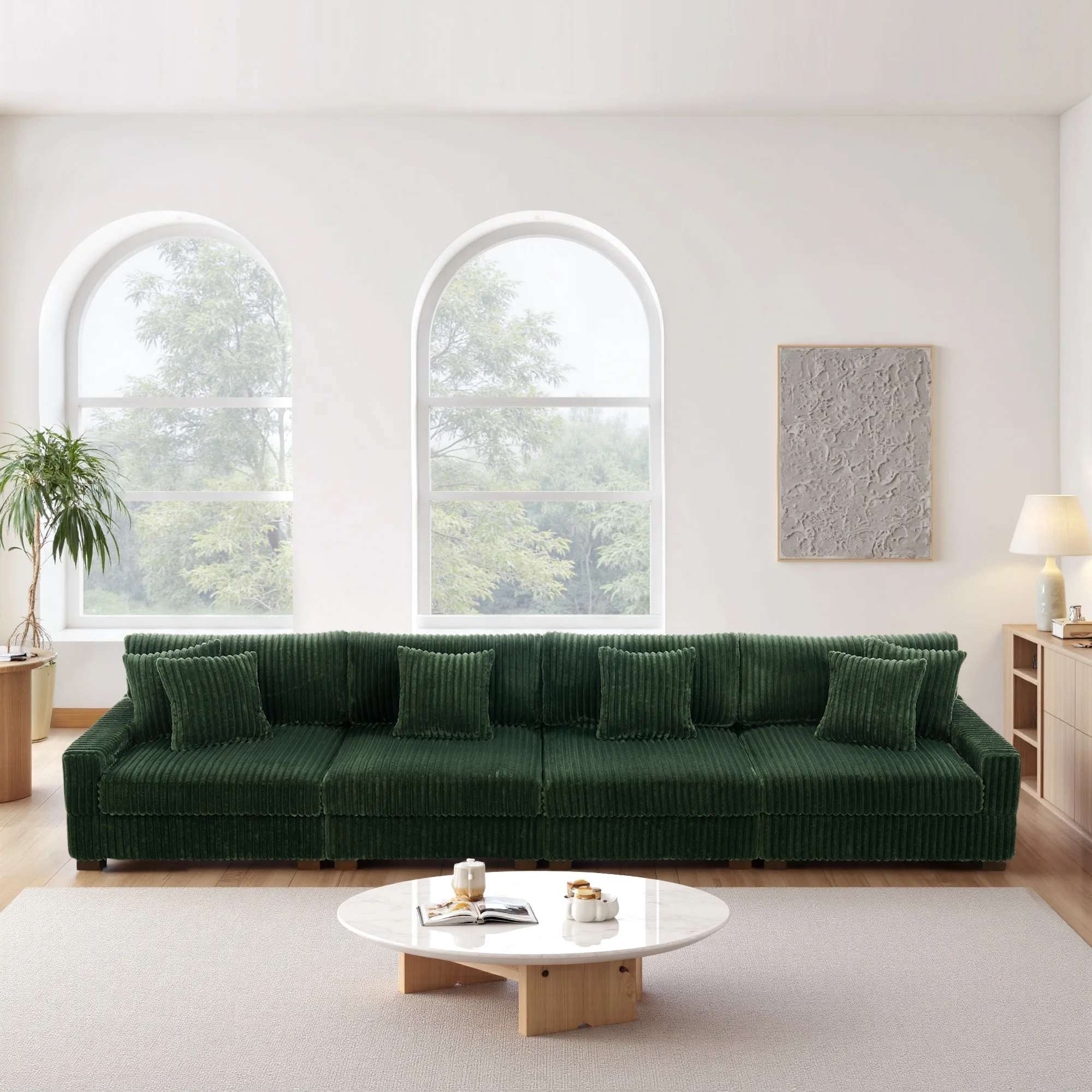 Kick back low and stay awhile with our Phydra 4-Seat Low Profile Upholstered Sectional Sofa. Two corner seats and two armless modules stretch out into a wide, relaxed run for movie nights, snack breaks, and friends dropping in. The low profile keeps sightlines open, so the room still feels airy even when everyone piles on. Sink into the cushioned seats, then settle against the back for an easy, supported lounge that does not feel stiff. Ribbed upholstery adds touchable texture and a clean, modern rhythm across the silhouette. Keep it simple, or bring in one or two matching ottomans for feet-up comfort, extra seating, or a tray moment.