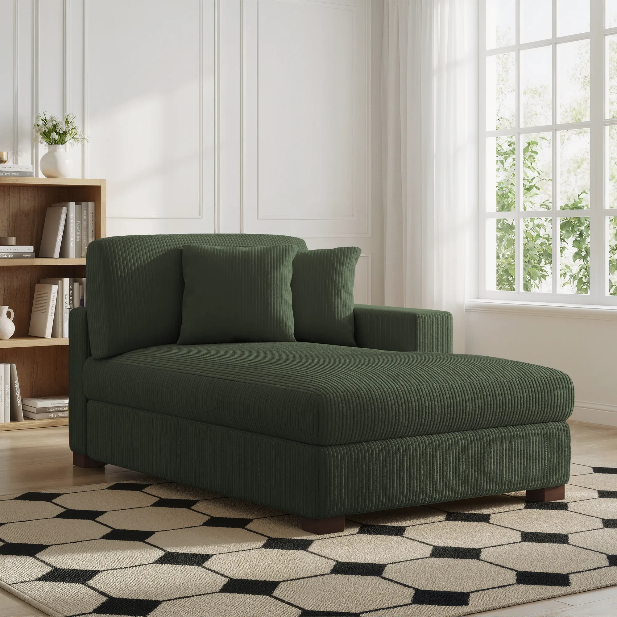 Includes 1 single-arm chaise lounge, 1 back cushion, and 2 matching pillows for layering.