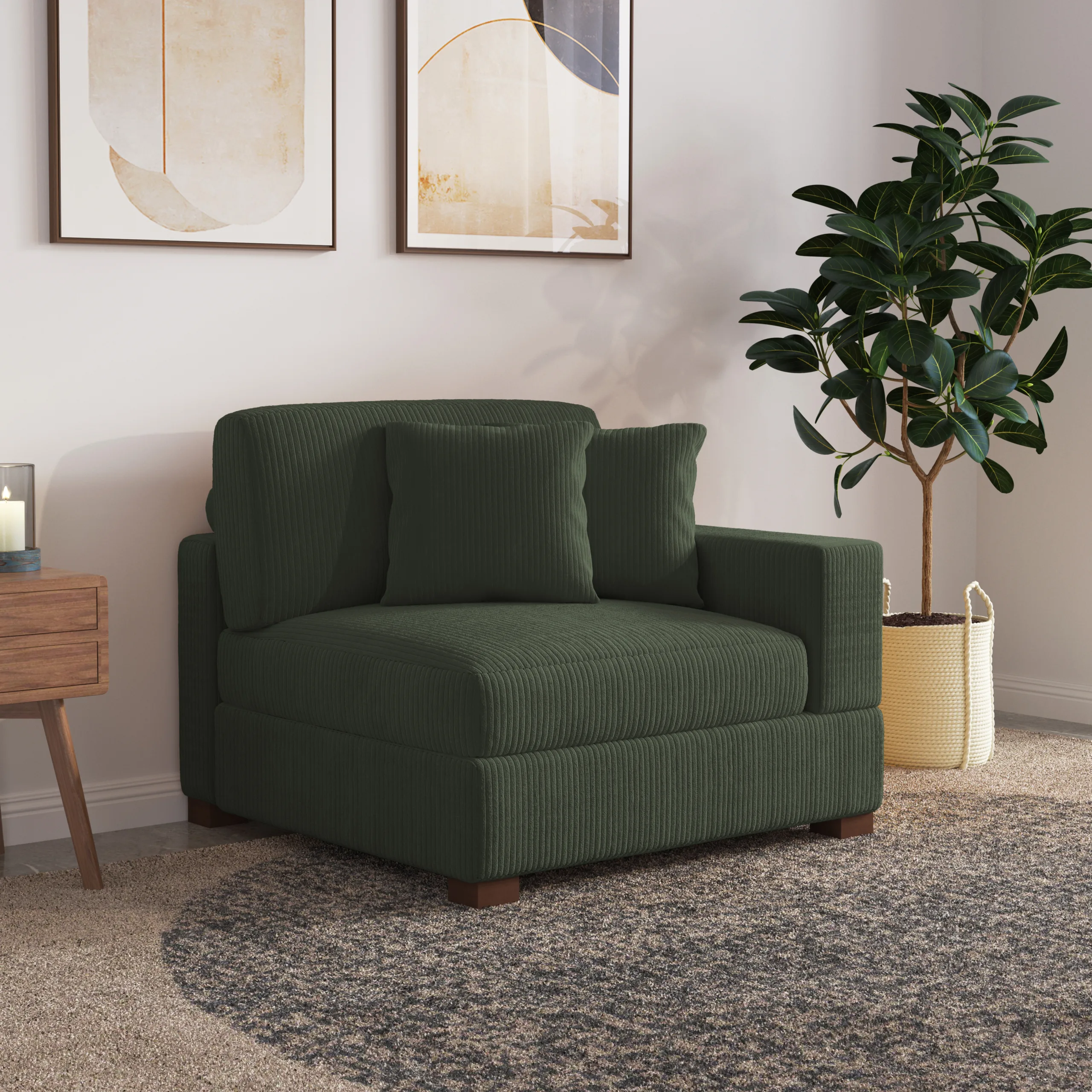 Includes 1 single-arm corner chair and 2 matching pillows for relaxed layering.