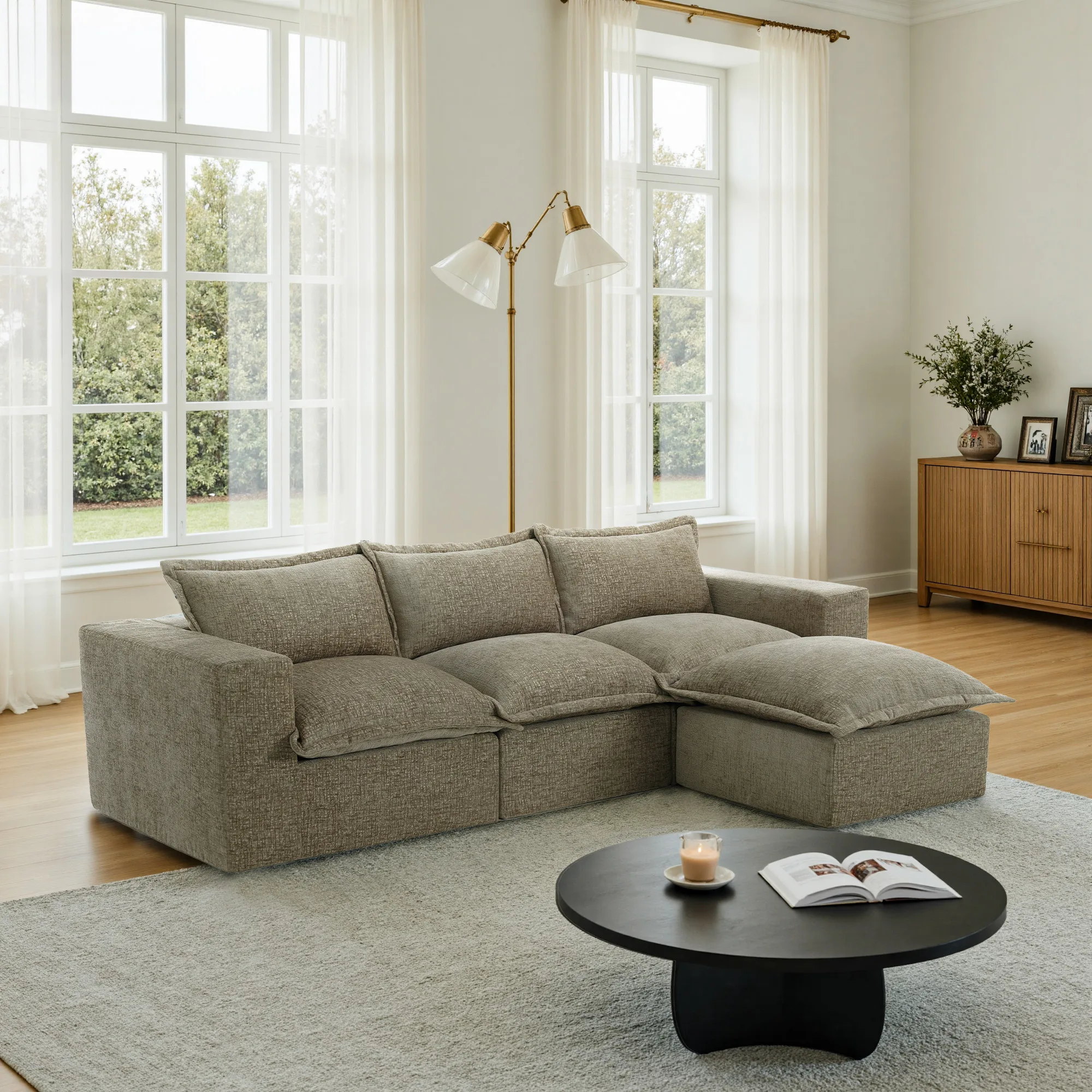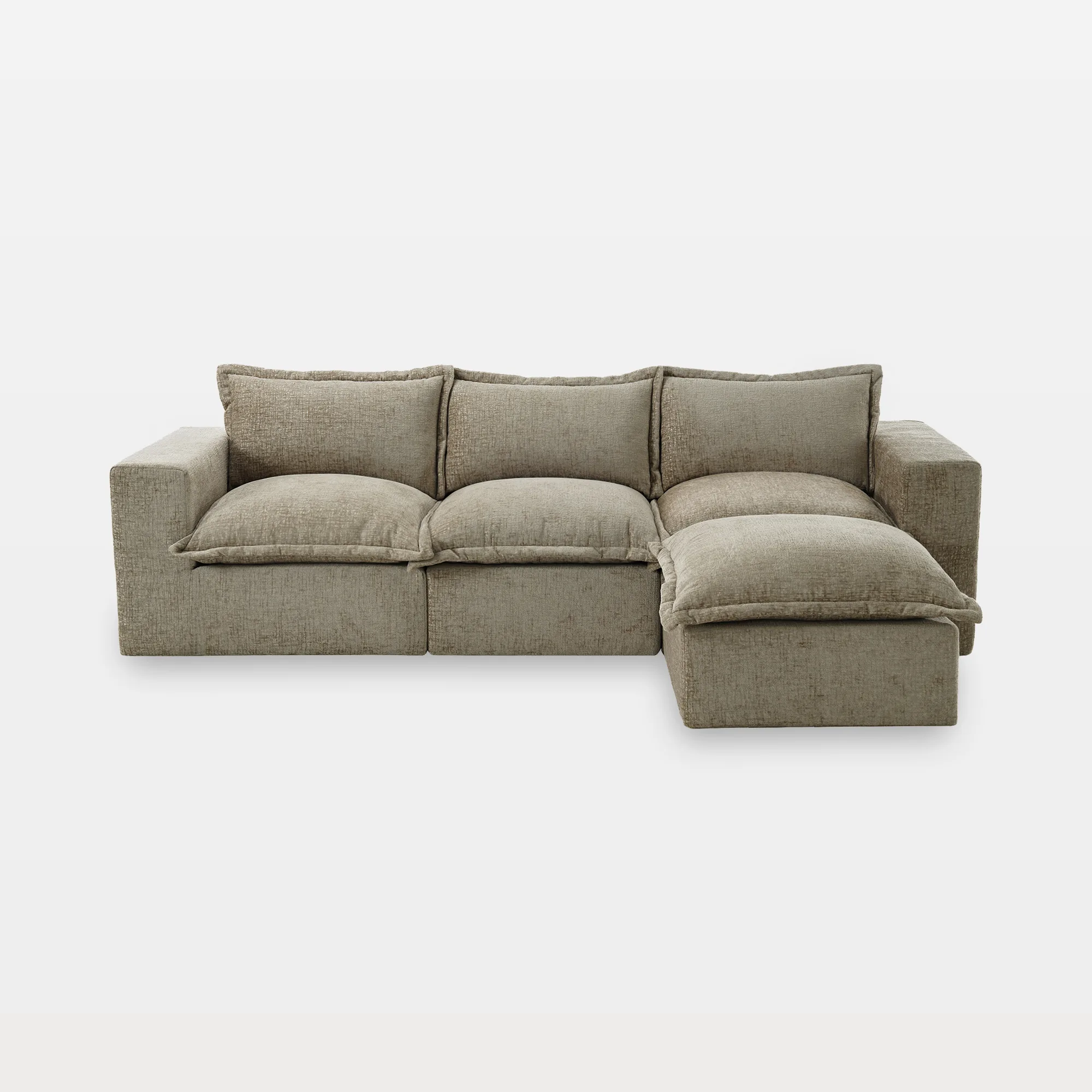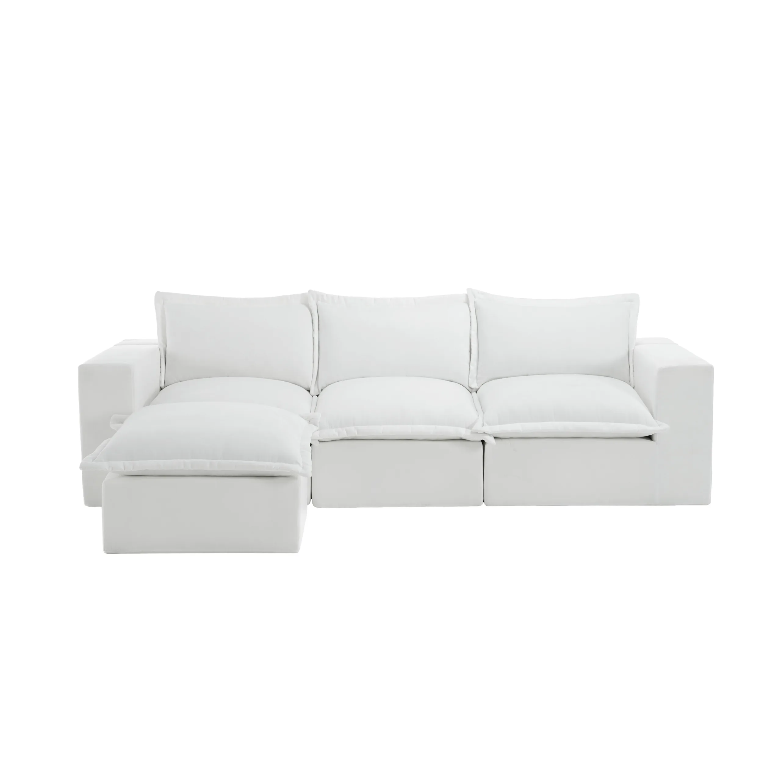 Keep lounging, snacking, and feet-up time simple with our Piereo 4-Piece Pillow Top Chenille Sectional Sofa with Ottoman. Pillow-top cushions wrap each module in warm chenille softness suited to everyday use. Thick foam padding supports sitting, stretching, and relaxed conversation. The movable ottoman works as a footrest, spare seat, or tray surface. With its low, legless profile, anti-slip bases, and Velcro cloth connectors, the layout stays steady and links easily with other Piereo modules as your space evolves.