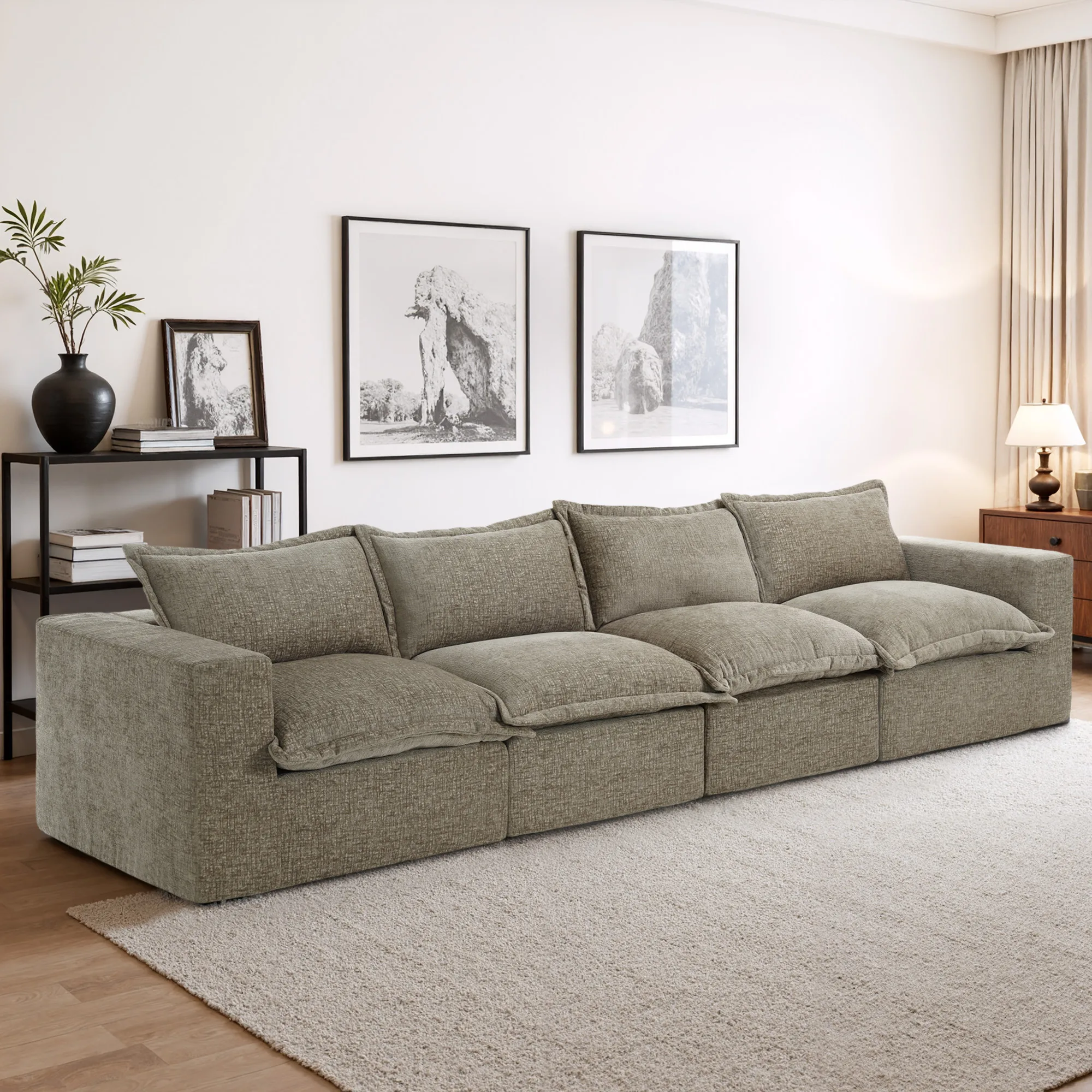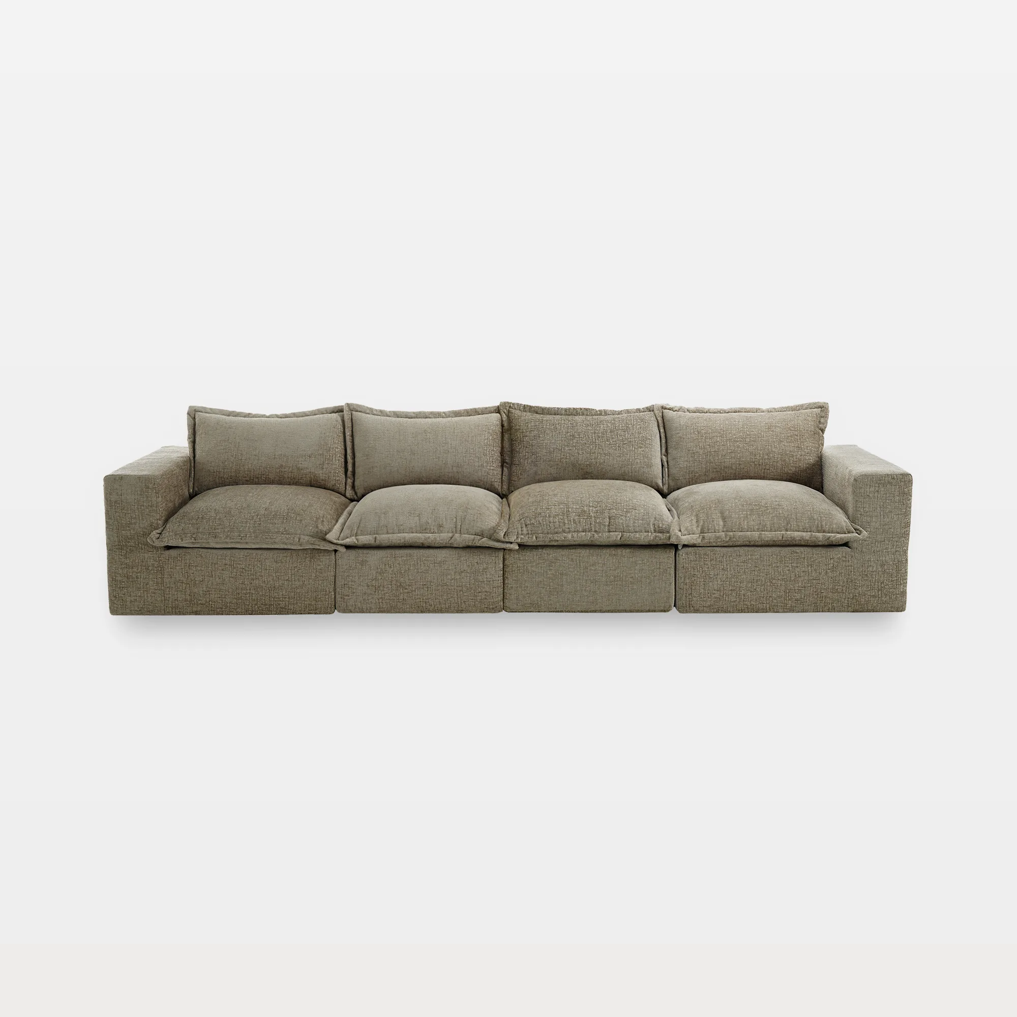 Keep everyone on the same comfy page with our Piereo 4-Piece Pillow Top Chenille Upholstered Sectional Sofa. Pillow-top cushions across each seat bring warm chenille softness from end to end. Thick foam padding supports relaxing, reading, or settling in with family. The low, legless silhouette creates grounded stability across the full length of the sectional. Anti-slip bases and Velcro cloth connectors keep all modules neatly aligned, and you can add more Piereo pieces whenever your room calls for extra seating.