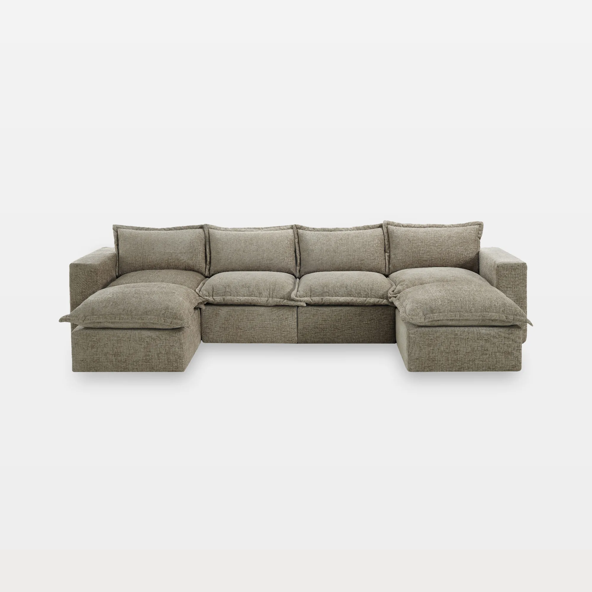 Keep conversations looping easily around our Piereo 6-Piece U-Shaped Pillow Top Chenille Sectional Sofa. Pillow-top cushions on every seat and ottoman bring soft, warm chenille comfort to group lounging. Thick foam padding supports movie nights, game nights, or long catch-up sessions. Two movable ottomans offer flexible seating, footrests, or tray-friendly surfaces. With a low, legless profile, anti-slip bases, and Velcro cloth connectors, the U-shape stays steady and can grow with additional Piereo modules.