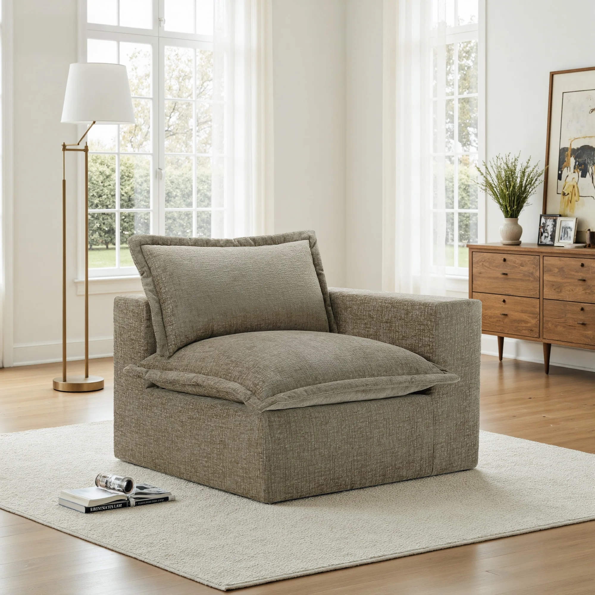 Give your shoulders somewhere easy to land on our Piereo Single Arm Pillow Top Chenille Modular Corner Chair. Pillow-top cushions on the back and seat offer soft contouring wrapped in warm chenille. Thick foam padding gives the seat steady, inviting support throughout the day. The low, legless design helps the corner sit naturally within larger or smaller layouts. Anti-slip padding and Velcro cloth connectors maintain neat alignment, allowing you to combine it with other Piereo modules seamlessly.