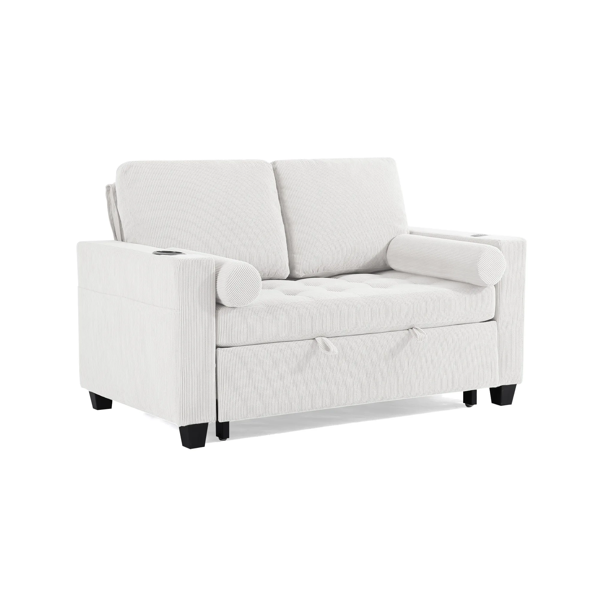 Make one compact loveseat pull triple duty with our Preslo Tufted Convertible Pull-Out Sleeper Bed Loveseat. Settle into it as a two-seat loveseat, then lean the adjustable back into a deeper recline when it is time to stretch out. When you need a place to sleep, the front platform pulls forward and lifts to form a flat sleeping surface sized for one person. Tufted corduroy on the seat and pull-out section adds soft ridged texture and helps the cushions feel supportive instead of saggy. A cup holder in one armrest keeps drinks steady, while the other side builds in USB and Type-C charging ports so you can plug in without reaching for a wall outlet. Finished with a generous side storage pocket for remotes, books, and chargers, this multitasking loveseat keeps small living rooms, offices, and guest corners feeling ready for whatever the day brings.