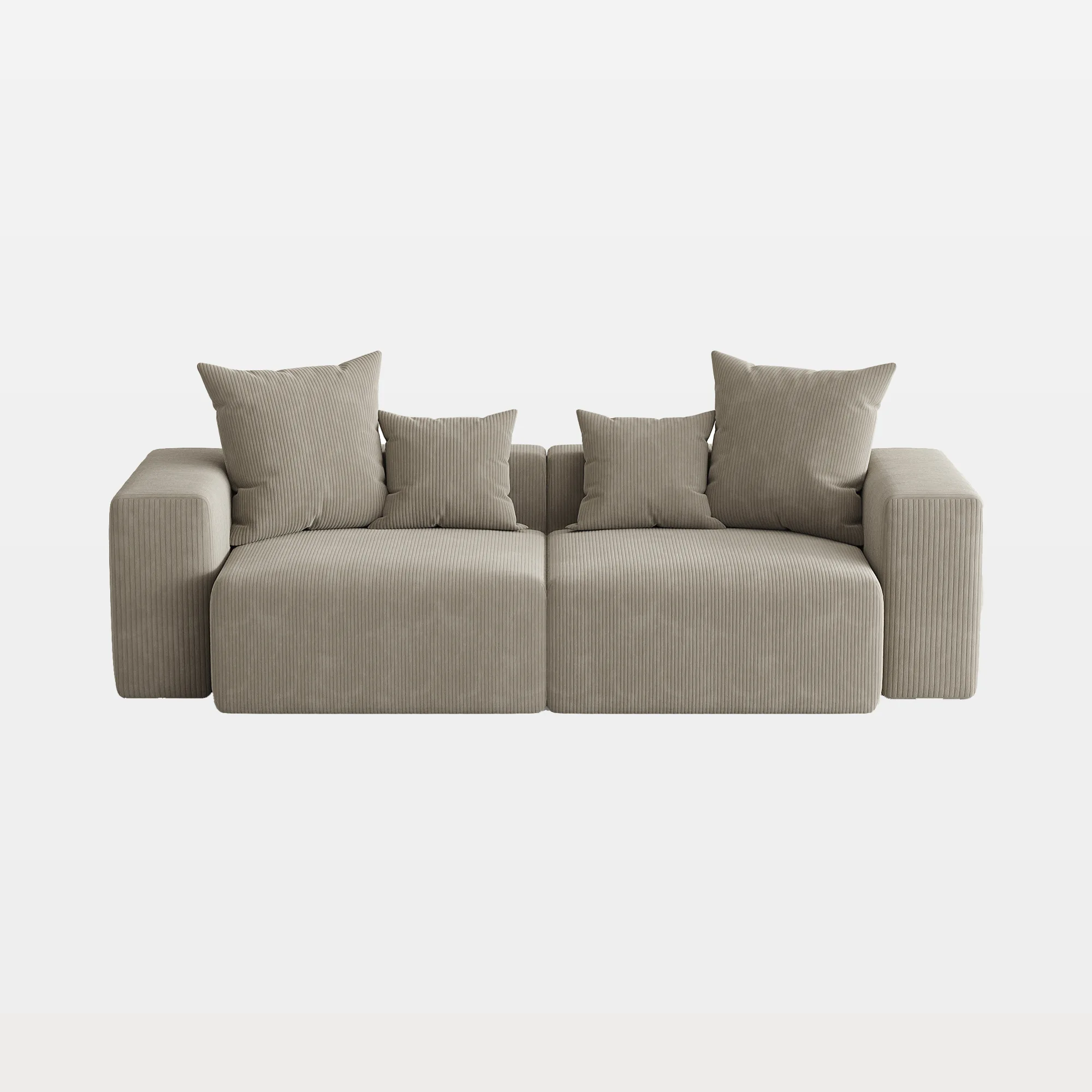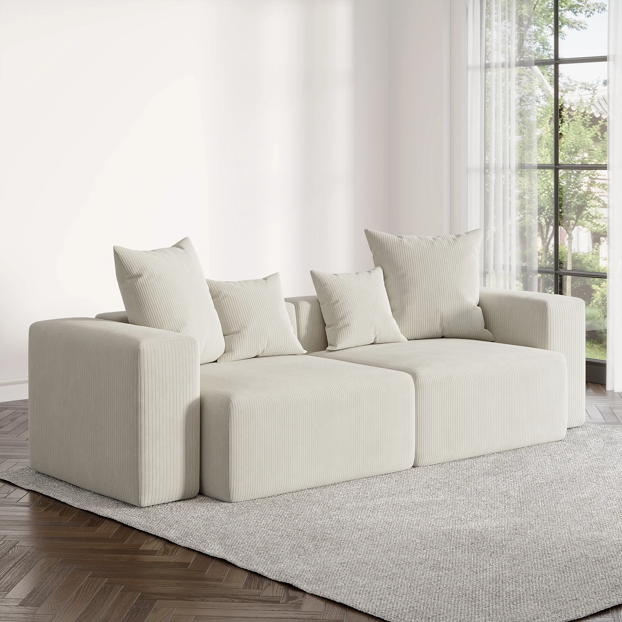 Unwind into a low, lounge-ready setup with our Reloom 2-Piece All-Foam Corduroy Modular Sofa with Pillows. Two single-arm corner chairs sit low to the floor with no legs, giving the room a calm, grounded look. Thick all-foam seats and backs feel substantial and supportive, with a soft give that invites long stays. Ribbed corduroy adds touchable texture, while oversized square arms double as the perfect place to rest your forearms. Non-slip bottoms and Velcro-style connector cloth help keep modules aligned as you reconfigure. Add the included pillows, and every corner feels cushioned, steady, and ready for company.