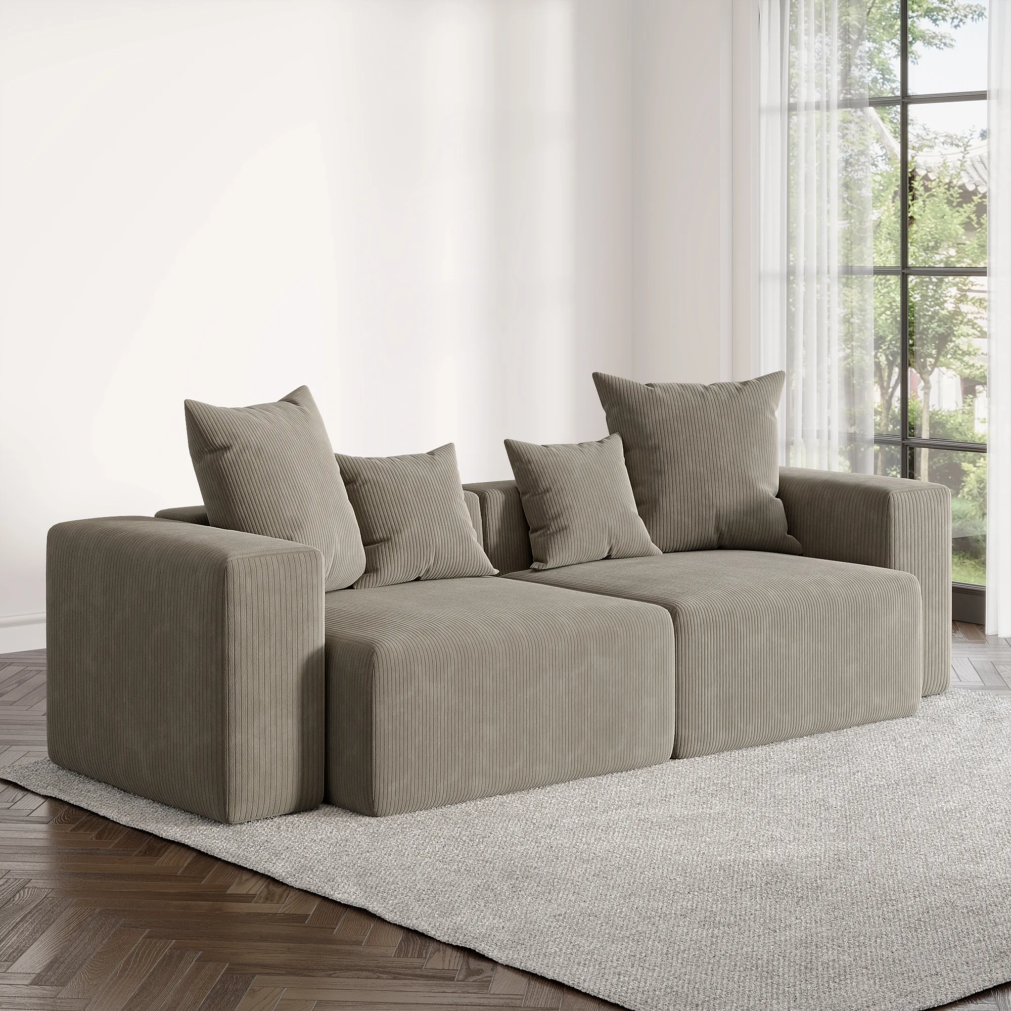 Ribbed corduroy upholstery adds soft texture and a subtle stripe that reads clean and modern.
