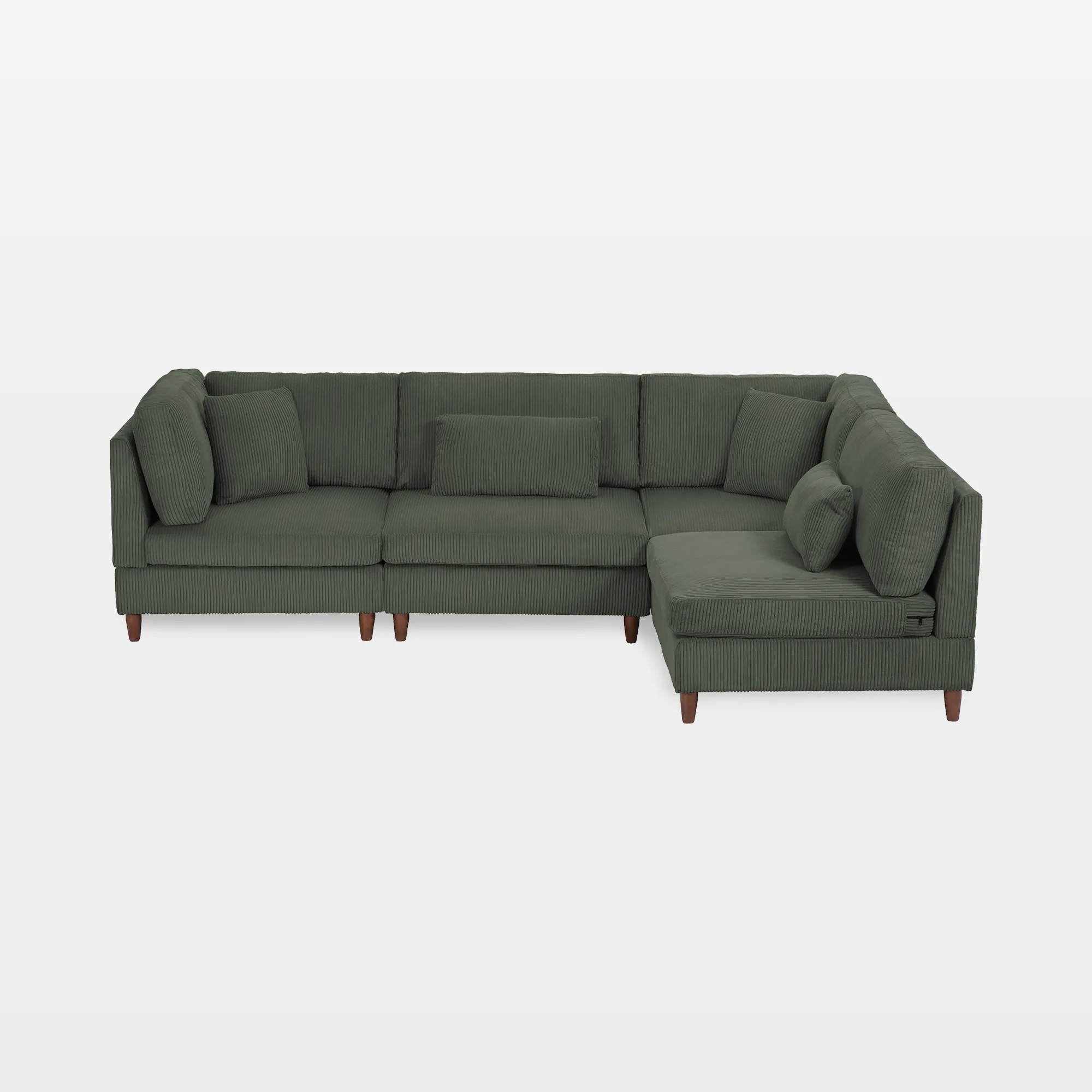 - The modular sofa features a cushioned back and small pillows for extra support and comfort.
