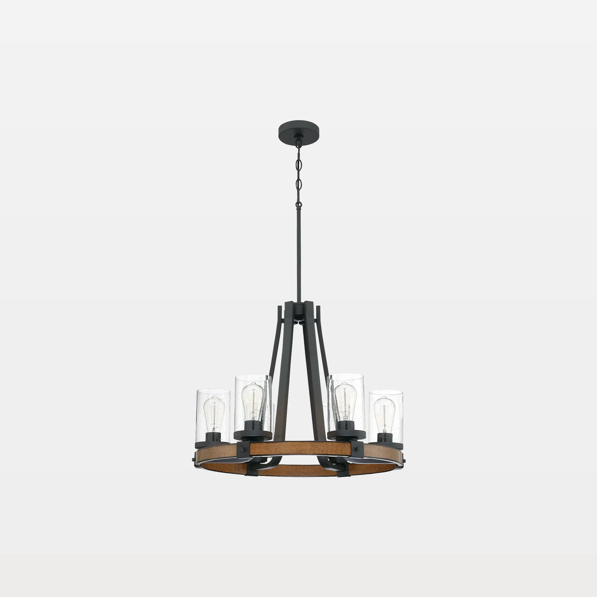 This chandelier makes a statement in any interior design without occupying valuable floor space, clear seeded glass shades complement the simple, yet striking black and wood combination. This wagon wheel-shaped chandelier is perfect for an entryway in need of a little illumination, a staircase seeking brightening, or a kitchen island searching for some shine. The perfect pick for offering the rustic charm of modern farmhouse decor to your home.