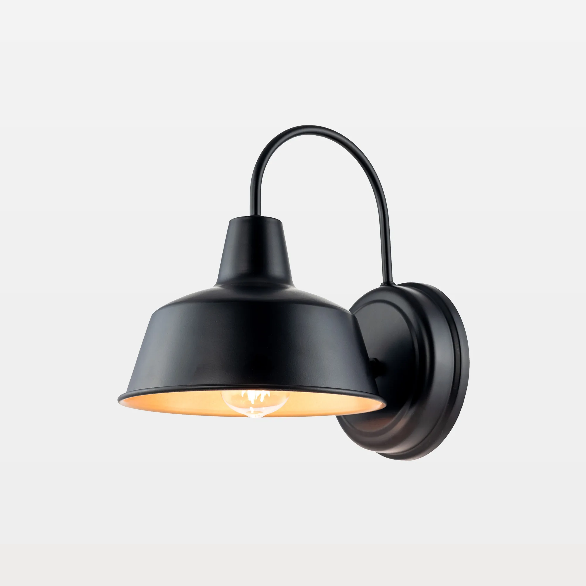 This outdoor barn light features a galvanized finish that adds charm and vintage-inspired style to your porch or main entrance. It’s crafted from metal, and it showcases a round, tapered backplate that connects to a sleek, curved arm. The bell-shaped shade at the end of the arm has a light finish on the inside for a rich color contrast. Its open design aims to ambient light all around your space from a single bulb up to 60W, which is sold separately. We love how its waterproof design stands up to rain showers.