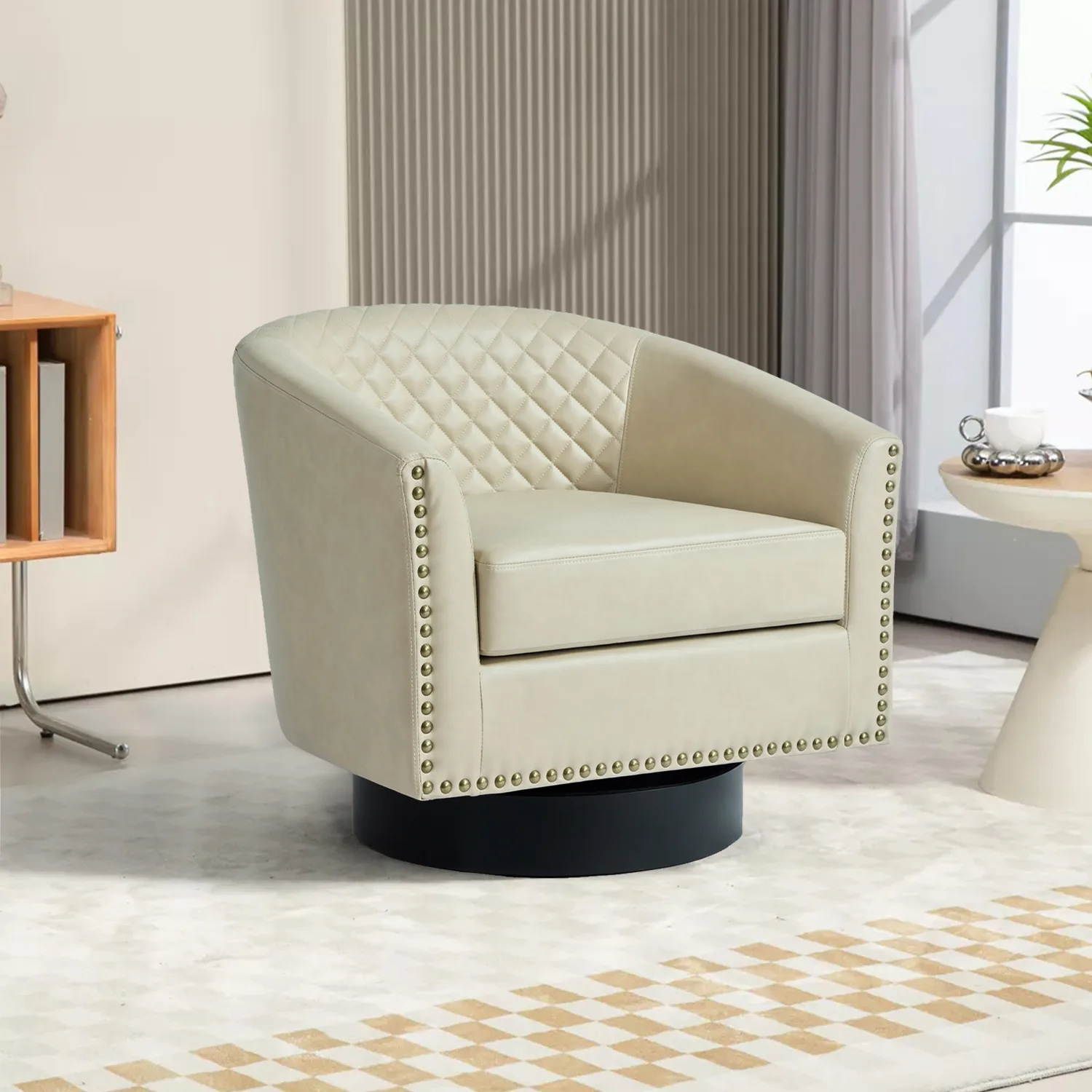 Let yesterday’s craftsmanship cues show up today with our Tandier Quilted Diamond Faux Leather Swivel Barrel Chair. The rounded barrel back is diamond-quilted for tailored texture and an easy, loungey hug. Padded arms and a thick seat cushion layer foam and coils for sink-in comfort with steady bounce. Brass-tone nailhead trim outlines the faux leather, adding vintage shine while staying simple to wipe clean. A dark round base swivels smoothly, so you can turn toward guests, the TV, or your next chapter without moving the chair.