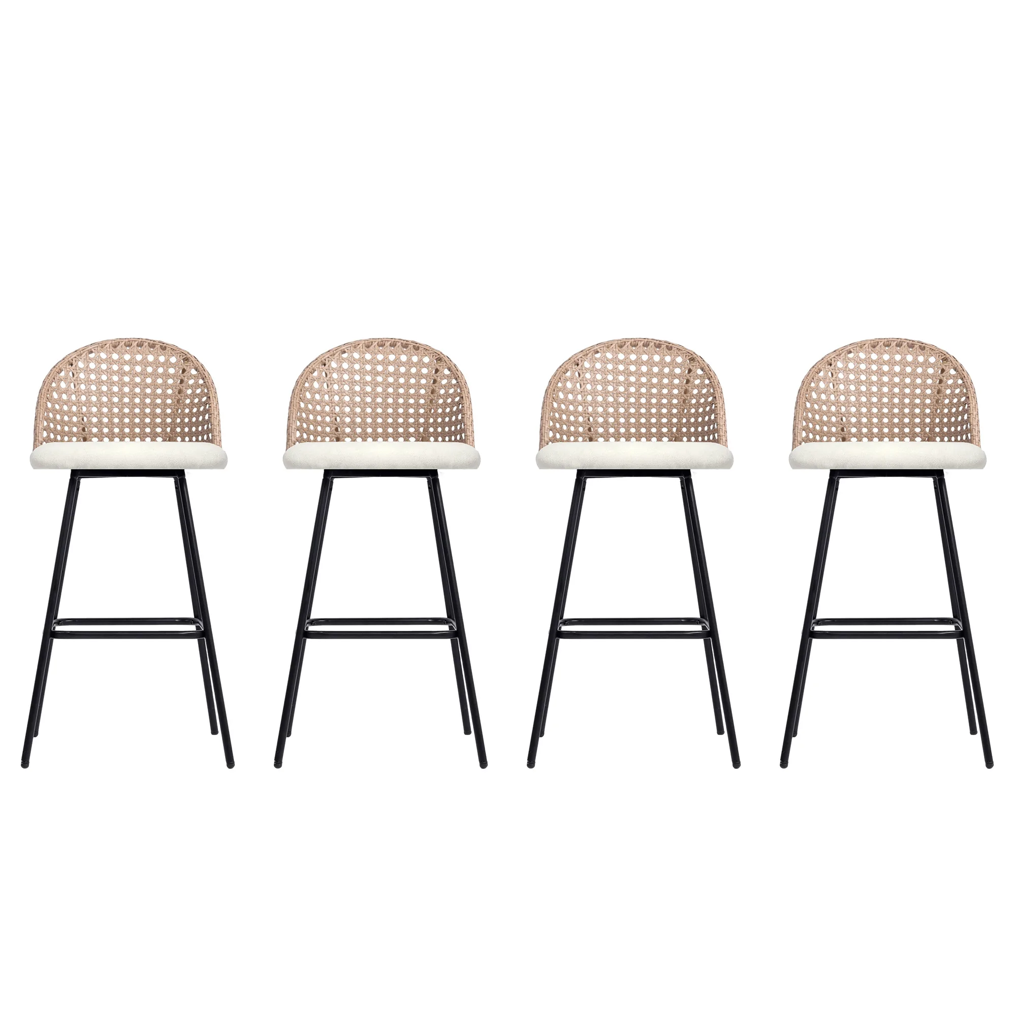 Take your home bar a little closer to the shoreline with our Tiraux Chenille Upholstered Wicker Bar Stools Set of 4. Rounded backs showcase a wicker-style weaving technique that echoes rattan caf?? seating while keeping the silhouettes open and airy. Chenille-upholstered, foam-filled seats offer soft, supportive comfort for long, easy talks at bar height. Slim metal legs and a square footrest steady each perch without weighing down the breezy look. Adjustable levelers under every leg help all four 29.5-inch seats sit even, so a full bar feels relaxed and composed.