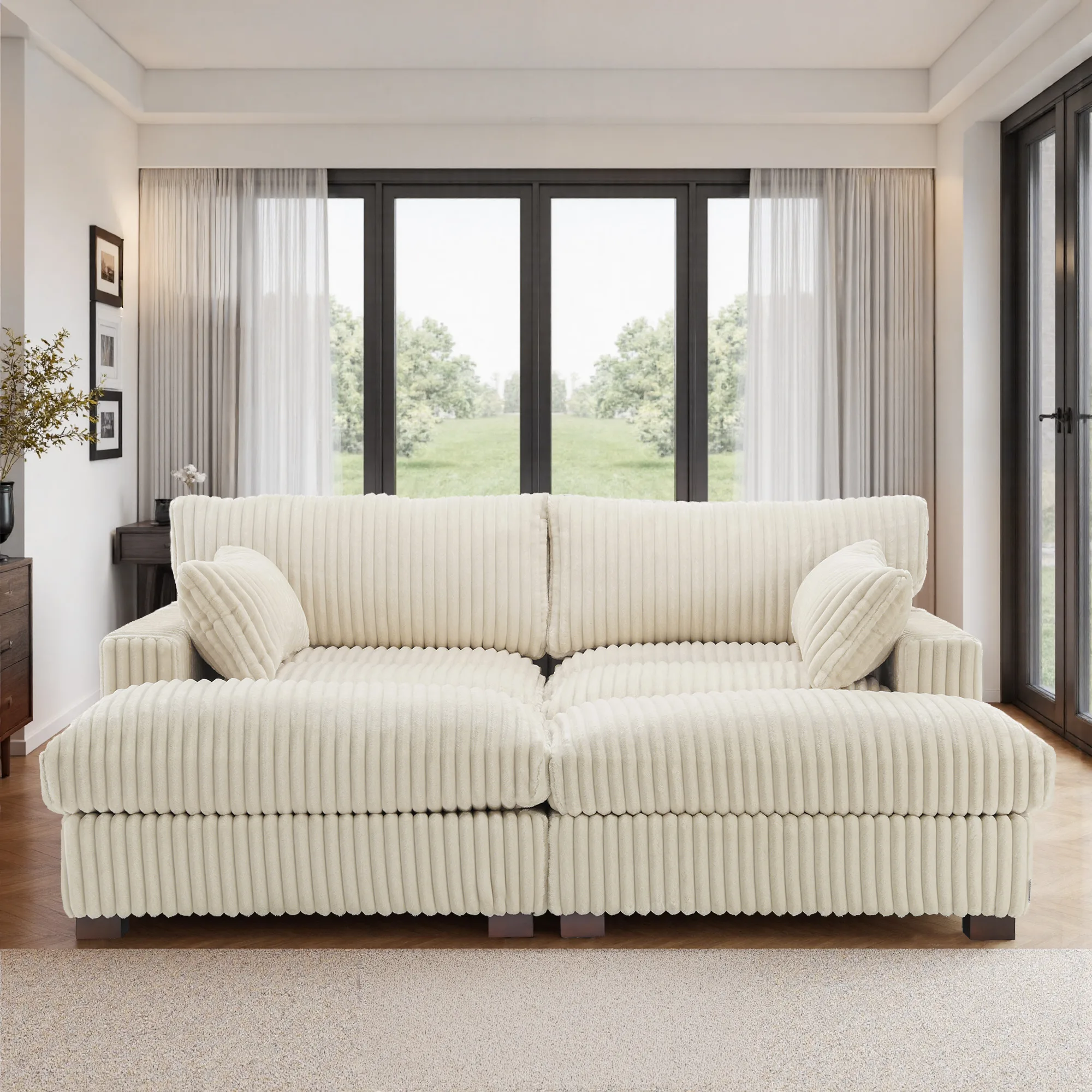 Want a double-chaise lounge moment that actually fits a real living room? Our Viviane 2-Seat Channel Tufted Faux Fur Chaise Sofa with Ottoman is built for two people to stretch out at once. One side is a true chaise module, while the second chaise-like spot is created by pairing the corner chair with the ottoman for an easy feet-up extension. Ribbed faux fur feels warm and touchable, and the channel-tufted seats keep the look tidy and structured. Inside, foam, pocket springs, and synthetic fiberfill deliver plush comfort with steady rebound. Each seat includes an independent 3-level adjustable headrest, and a metal connector helps keep the two seating modules aligned so the whole setup stays cohesive and lounge-ready.