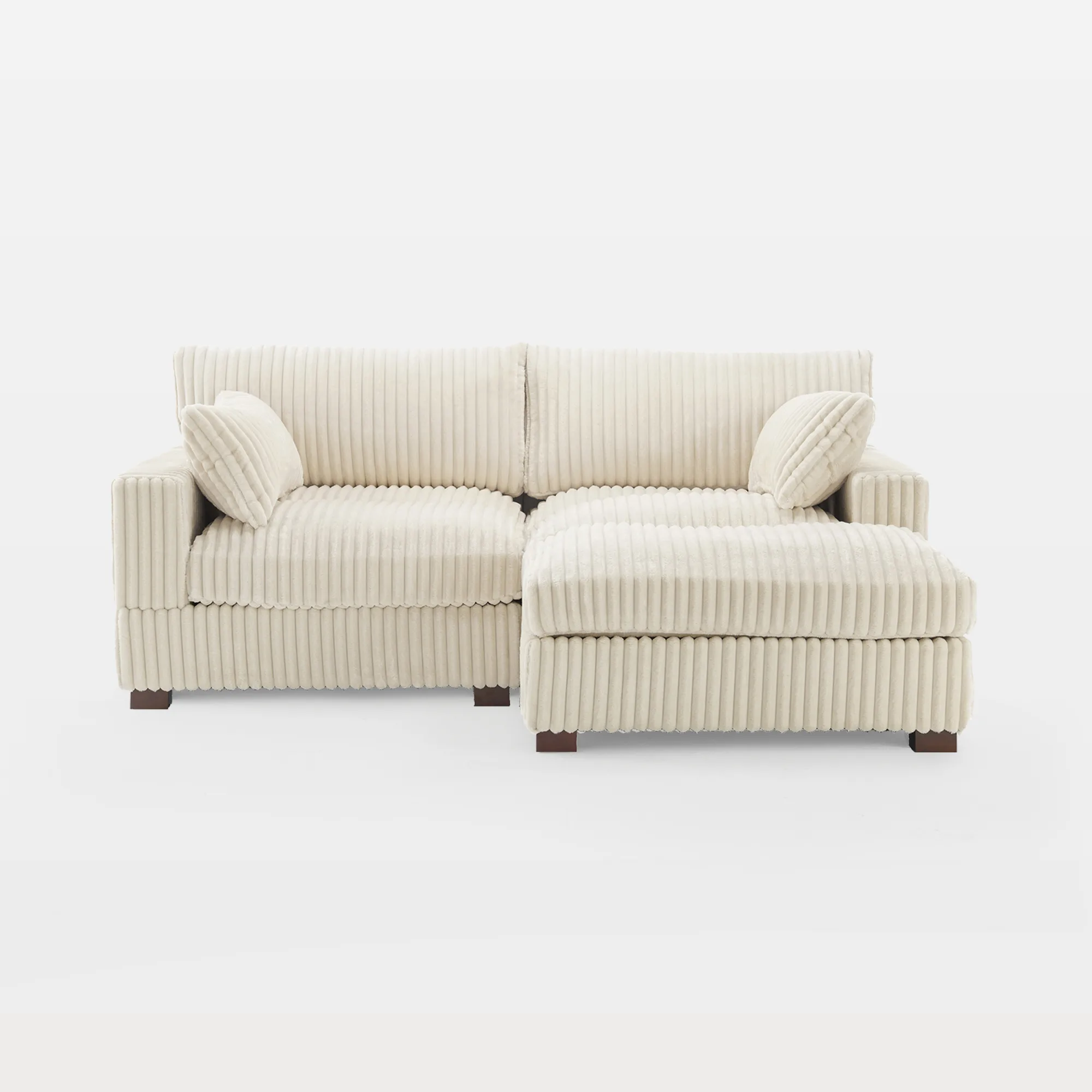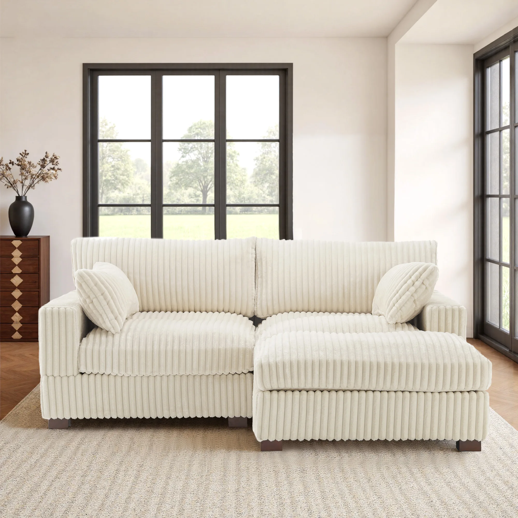 Want a snug two-seat setup that can sprawl out when the mood hits? Meet our Viviane 2-Seat Channel Tufted Faux Fur Modular Sofa. Start with two corner seats, then choose your add-on: one ottoman for feet-up lounging, two ottomans for extra stretch, or two extra pillows for a layered look. Ribbed faux fur feels warm and inviting, while channel tufting keeps the shape tidy. Under the seats, foam, pocket springs, and synthetic fiberfill balance softness with support. Anti-slip Velcro beneath the cushions and metal connectors help keep modules aligned. Go with one or two ottomans or extra pillows, and let comfort meet you where you live.