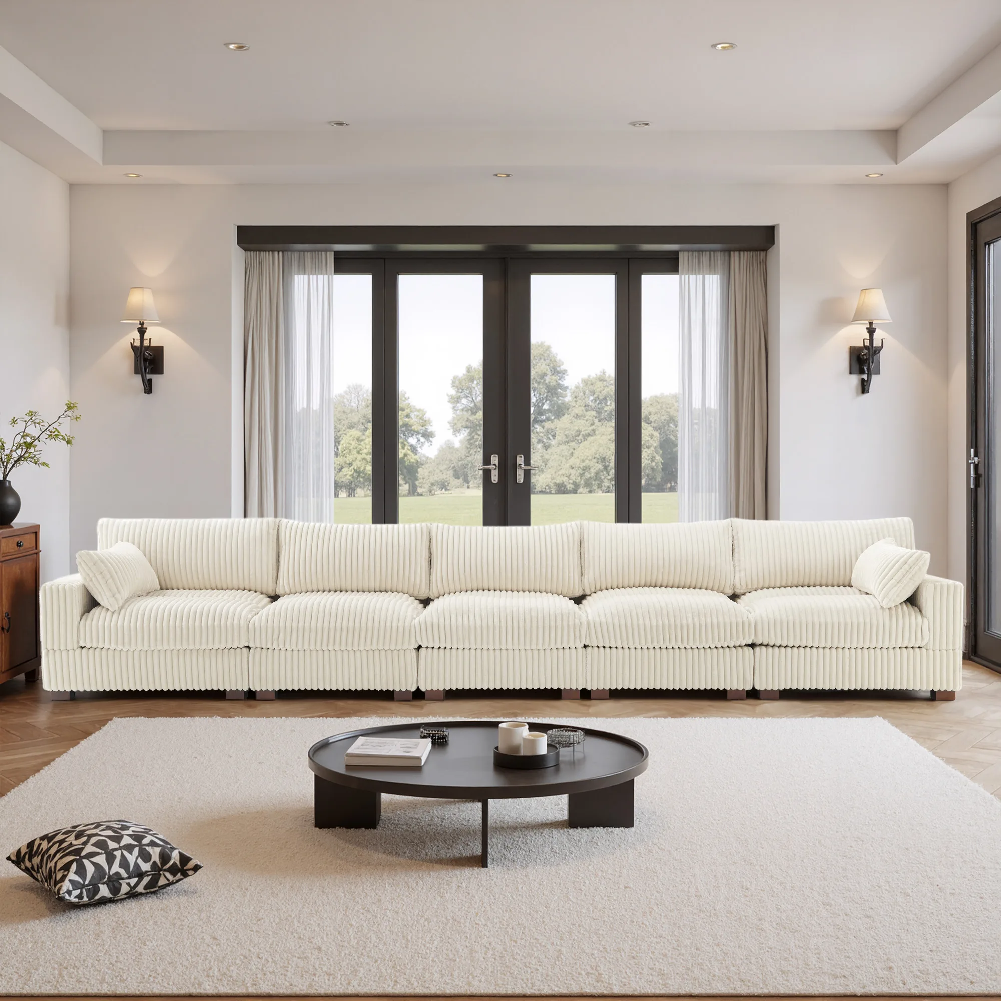 Spread out like you mean it and let our Viviane 5-Seat Channel Tufted Faux Fur Sectional Sofa set the pace tonight. Choose a streamlined layout with no ottoman, add one for feet-up lounging, or go with two for extra flexibility. Foam pairs with pocket springs and synthetic fiberfill to create cushioned comfort with structure. Ribbed faux fur upholstery feels warm and touchable, while channel tufting across the corner seats and armless seats keeps the look tidy and tailored. Each seat includes a 3-level adjustable headrest for neck support. Anti-slip Velcro beneath the cushions and metal connectors keep modules aligned. From end to end, it brings the whole room together for slower, better everyday living.
