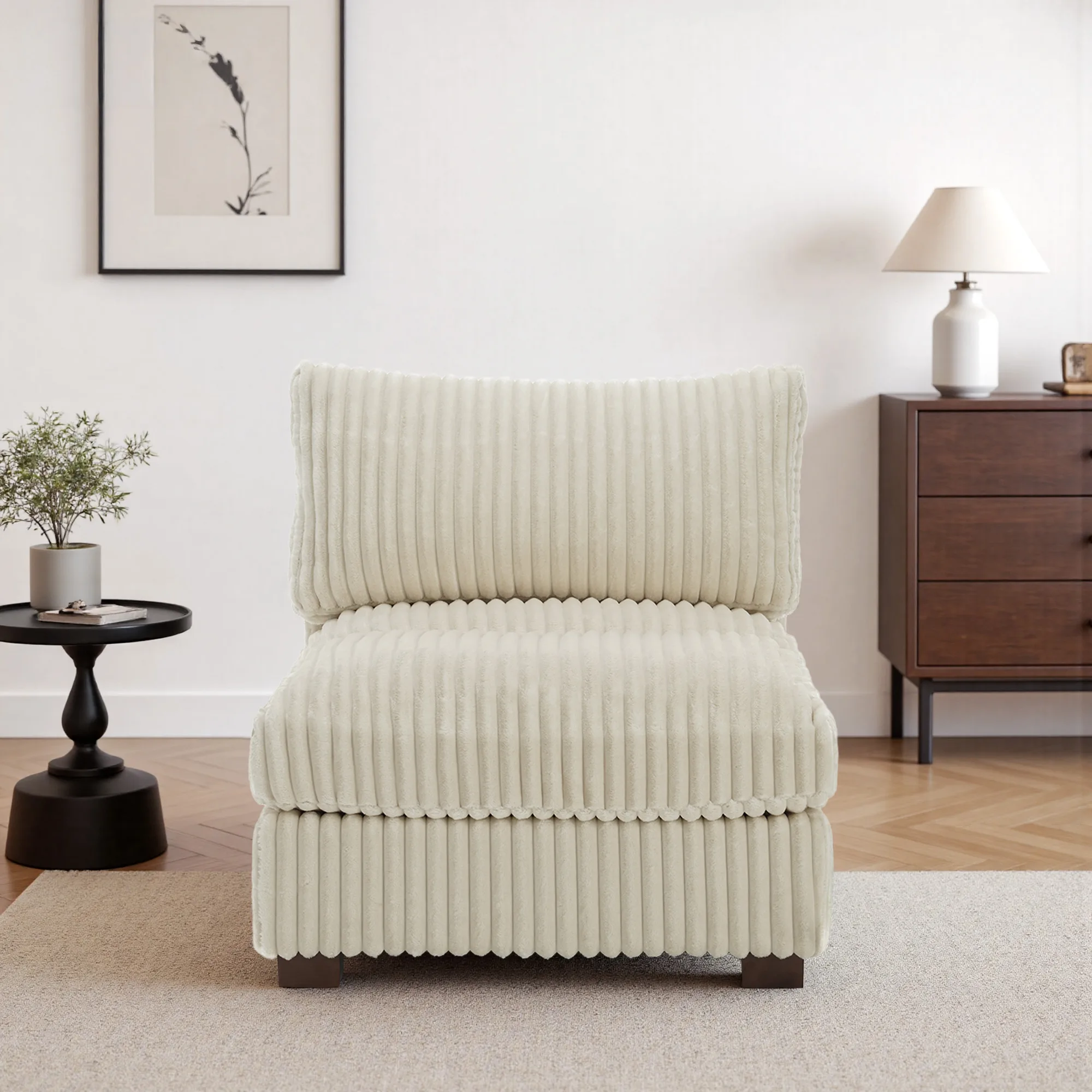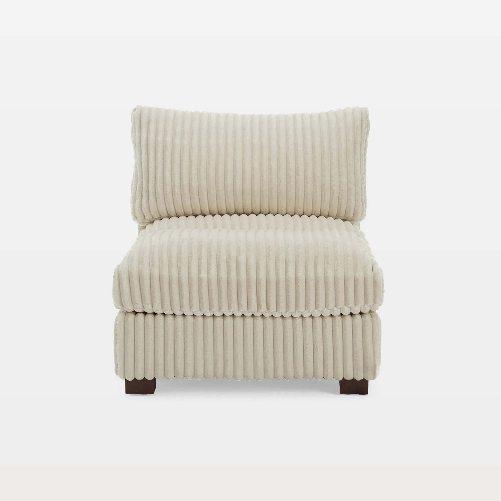 Ready to build your coziest corner, one piece at a time? Our Viviane Channel Tufted Faux Fur Modular Armless Chair sets the foundation with ribbed faux fur upholstery that feels warm, soft, and inviting. Channel tufting across the seat adds clean structure under the plush surface. Inside, foam, pocket springs, and synthetic fiberfill create padded comfort with a steady, lounge-friendly bounce. Each seat includes an independent 3-level adjustable headrest, so neck and head support can match how you sit or recline. Square, low wood legs keep it steady and low, and the armless shape makes it easy to place anywhere your layout needs softness.